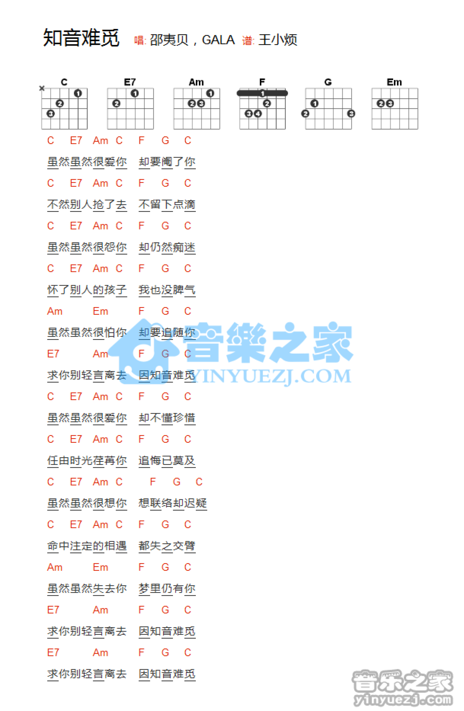 知音难觅吉他谱 - 邵贝夷/GALA - C调吉他弹唱谱 - 和弦谱