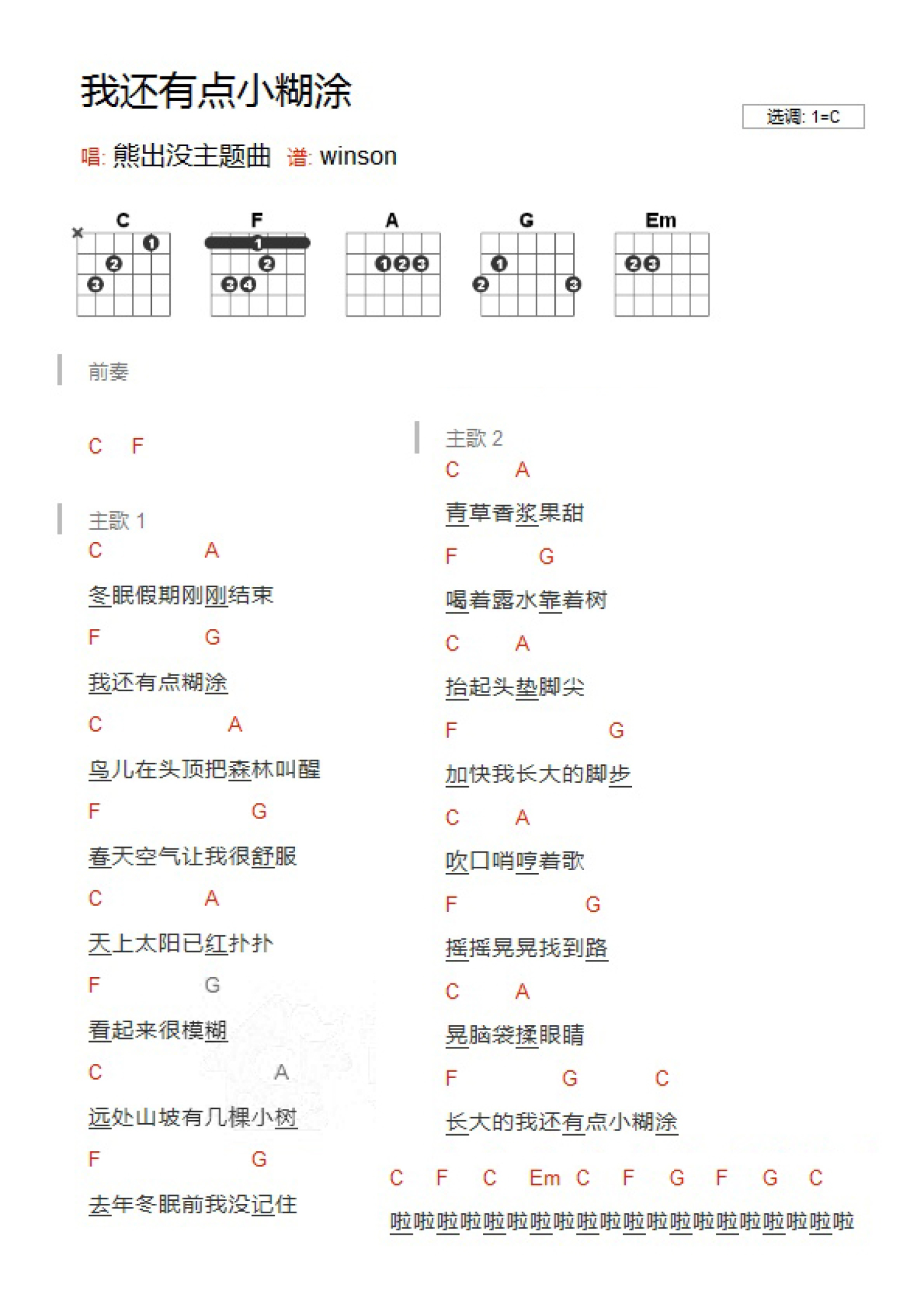 我还有点小糊涂吉他谱 - 熊出没 - C调吉他弹唱谱 - 和弦谱