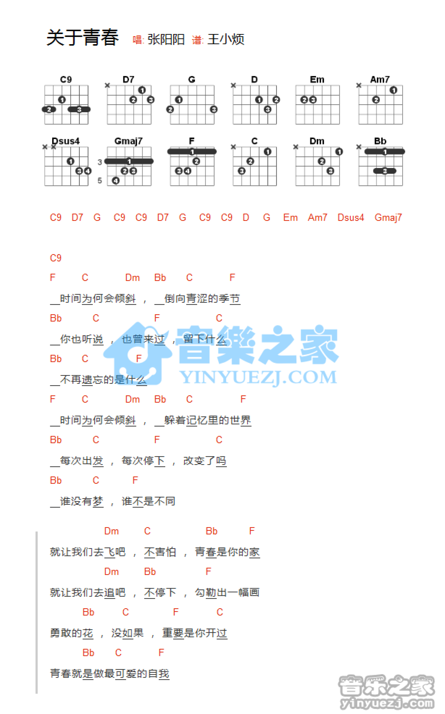曲谱介绍: 《关于青春》吉他和弦弹唱谱