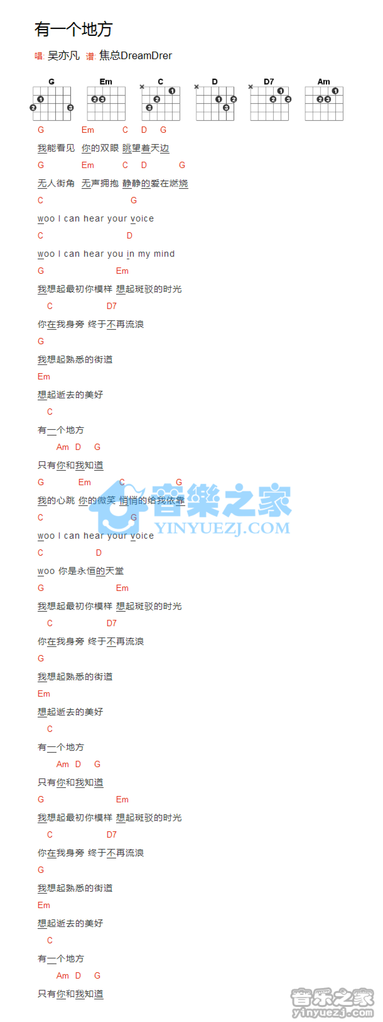 曲谱介绍: 《有一个地方》吉他和弦弹唱谱