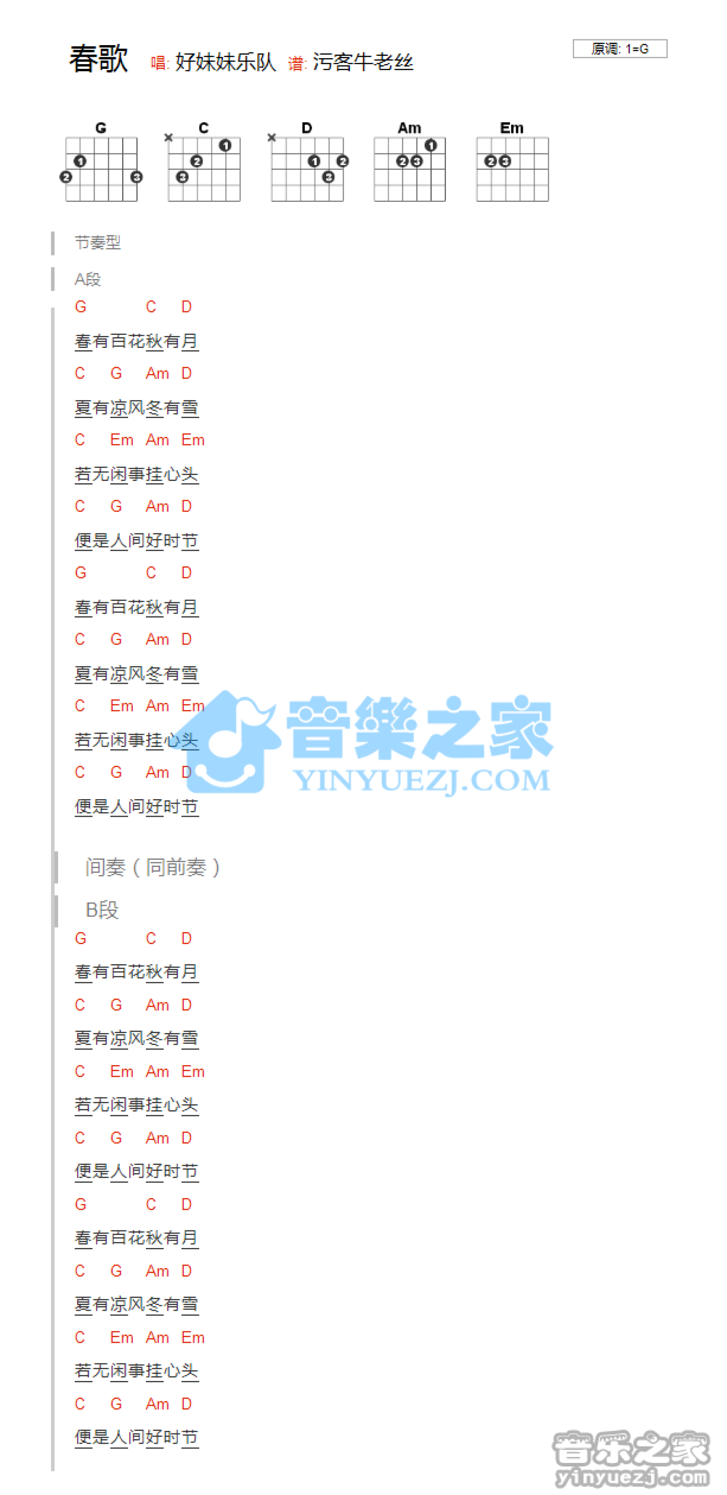 曲谱介绍: G调版《春歌》吉他和弦弹唱谱