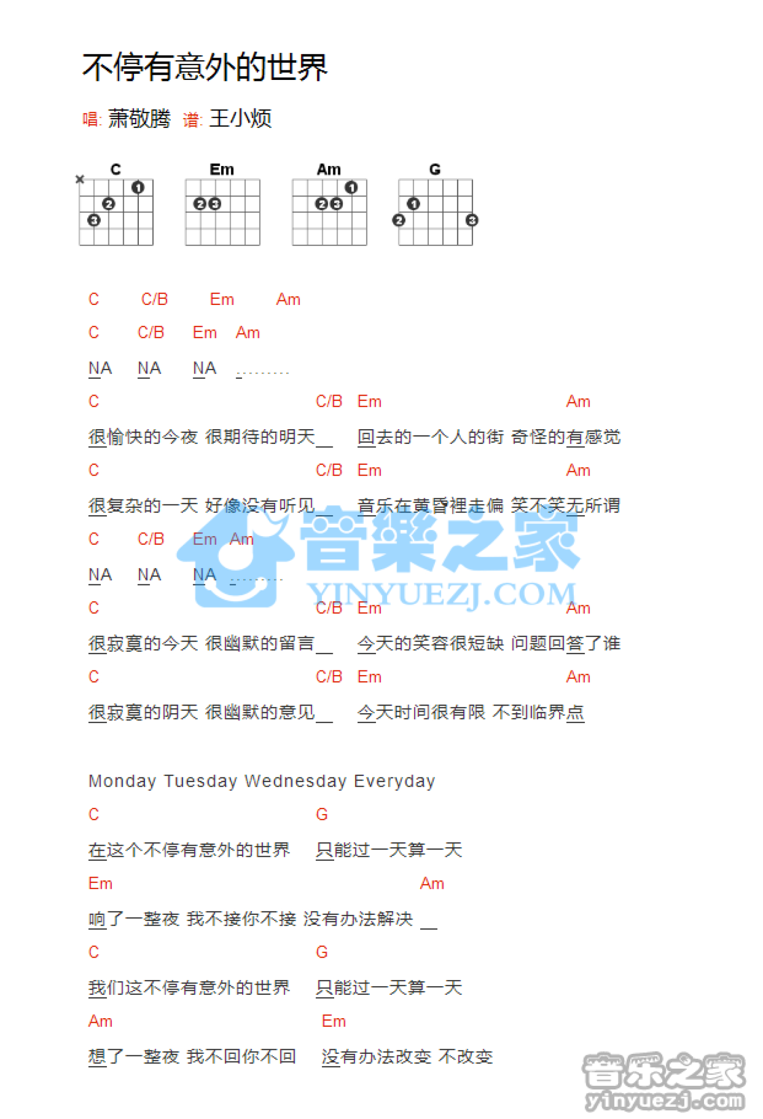 曲谱介绍: 《不停有意外的世界》吉他和弦弹唱谱