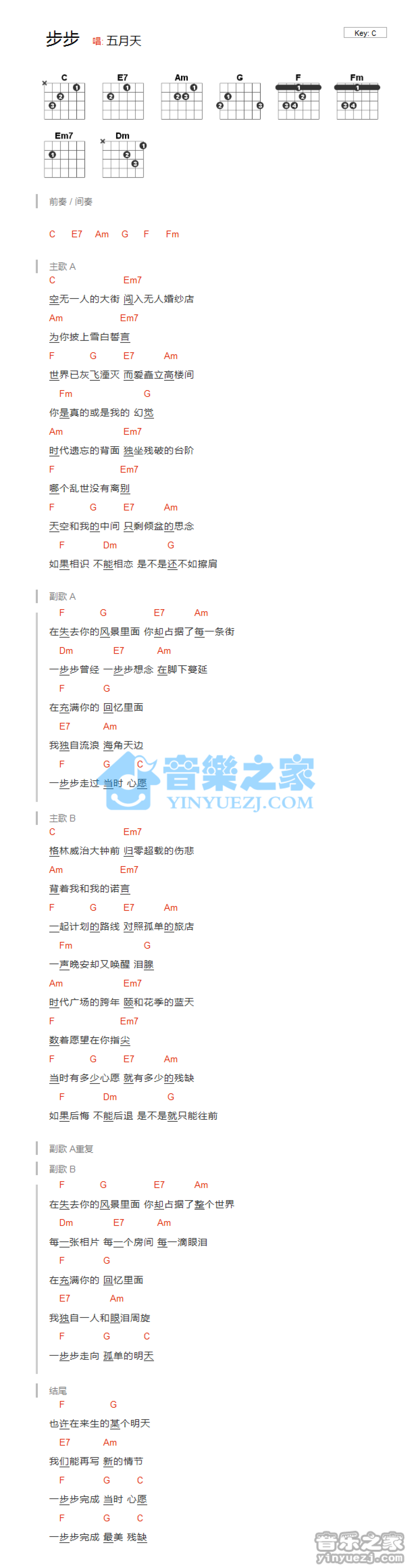 曲谱介绍: C调版《步步》吉他和弦弹唱谱