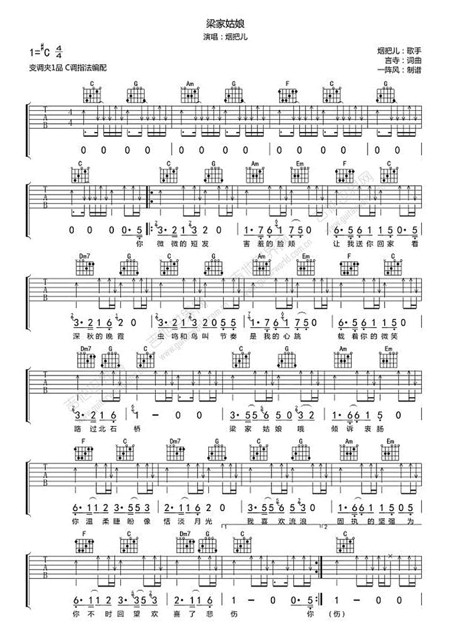 梁家姑娘吉他谱 - 烟把儿 - C调吉他弹唱谱