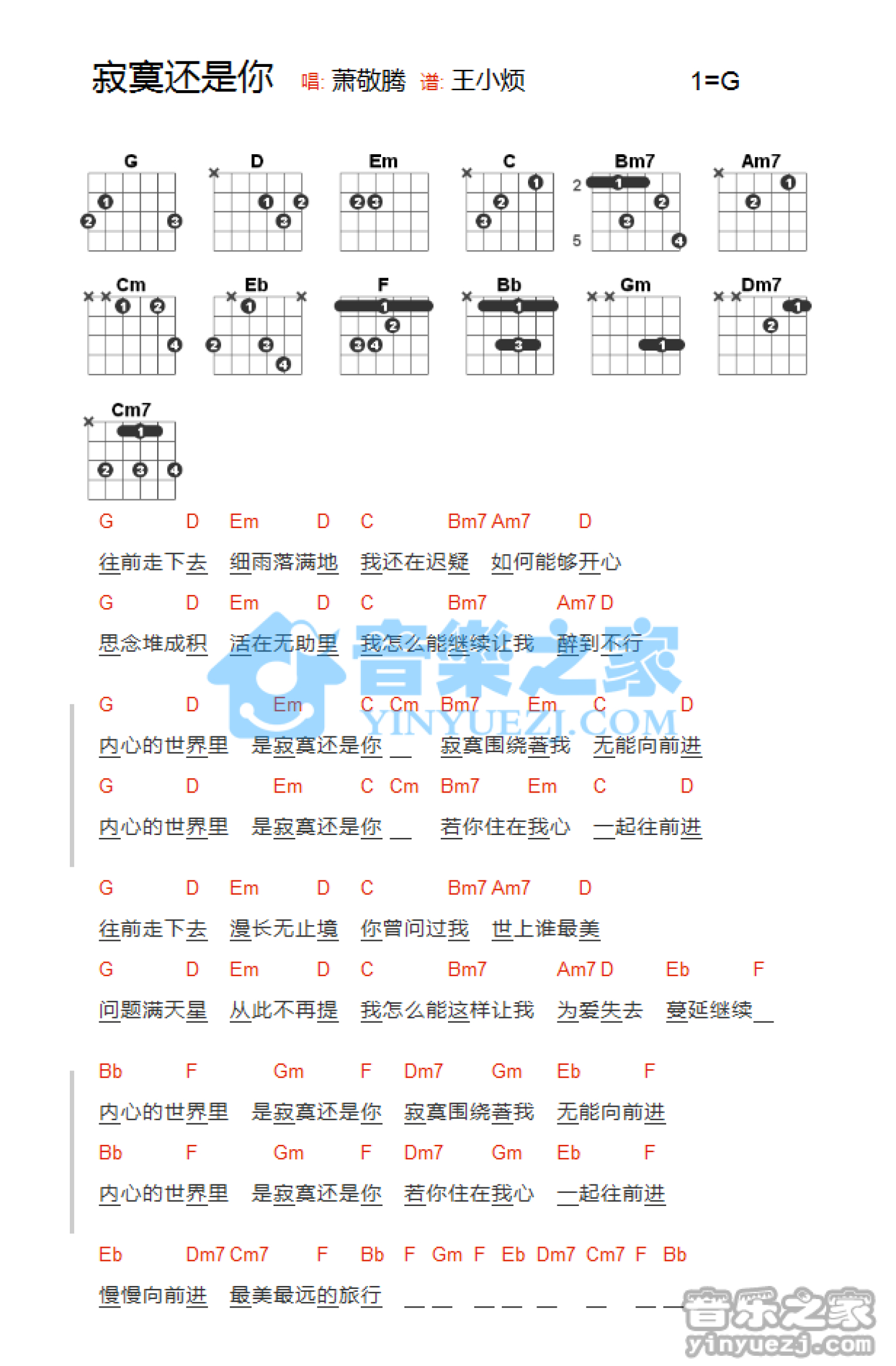 曲谱介绍: G调版《寂寞还是你》吉他和弦弹唱谱