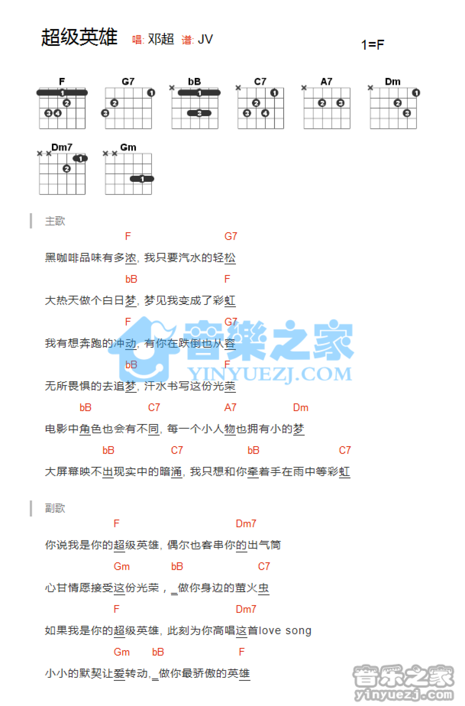 曲谱介绍: F调版《超级英雄》吉他和弦弹唱谱
