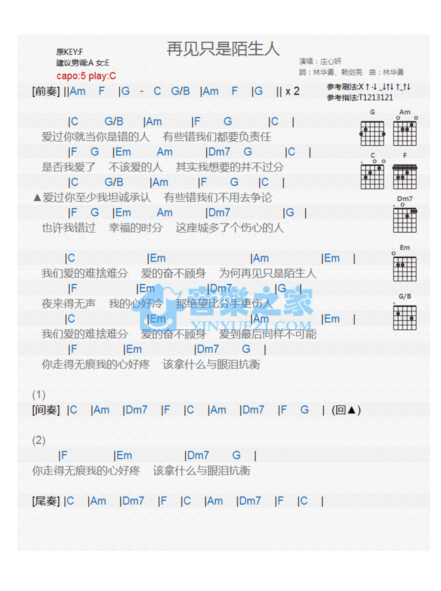 曲谱介绍: 庄心妍《再见只是陌生人》吉他谱_C调吉他弹唱谱_和弦谱