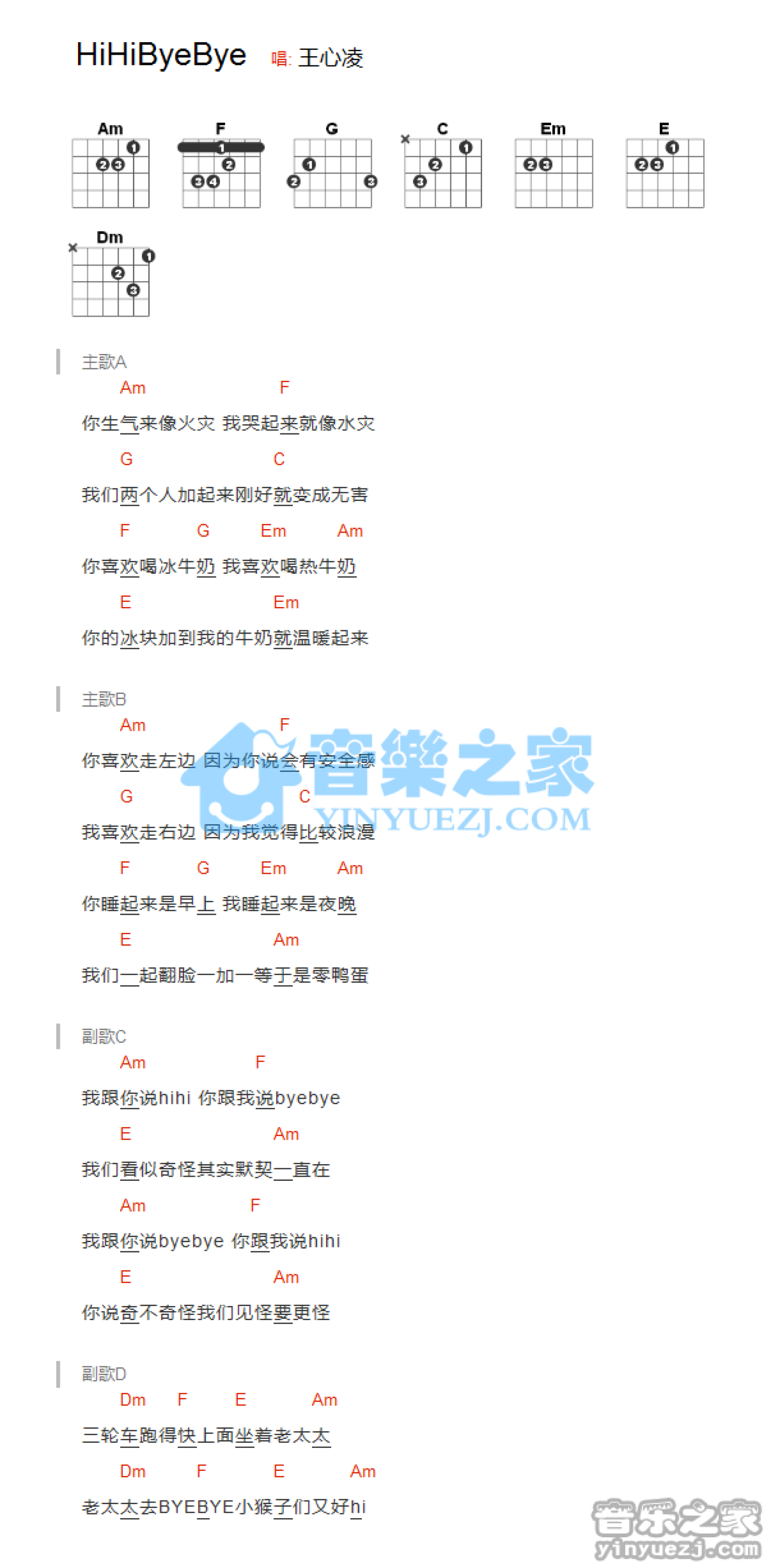 HiHiByeBye吉他谱 - 王心凌 - 吉他弹唱谱 - 和弦谱