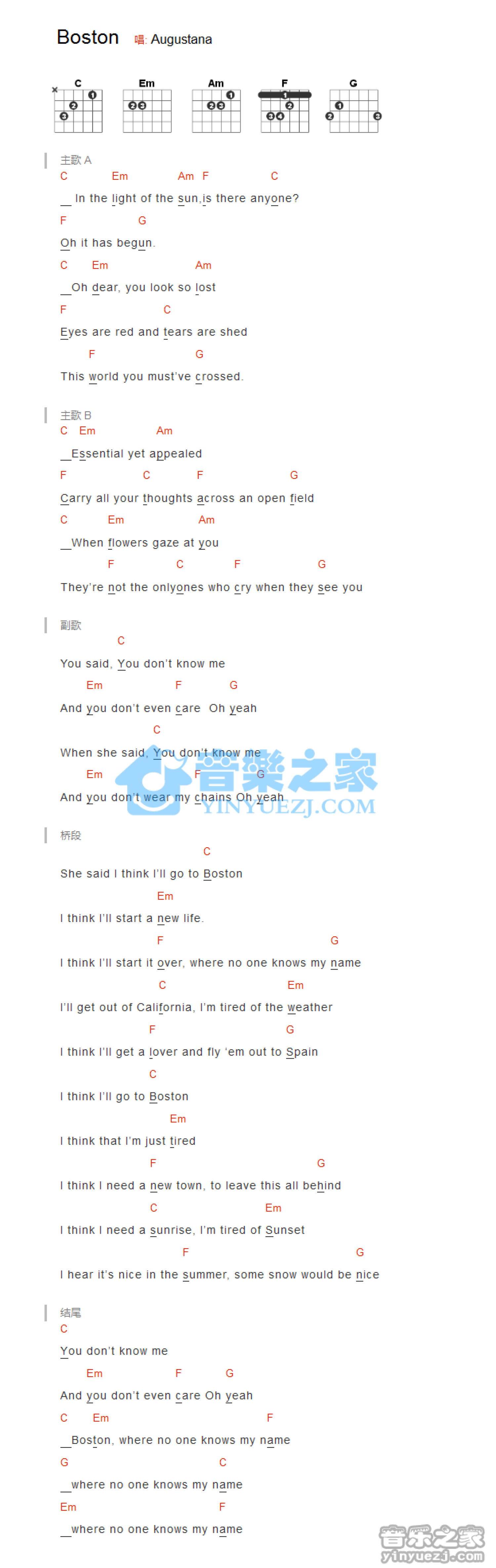 曲谱介绍: 《Boston》吉他和弦弹唱谱