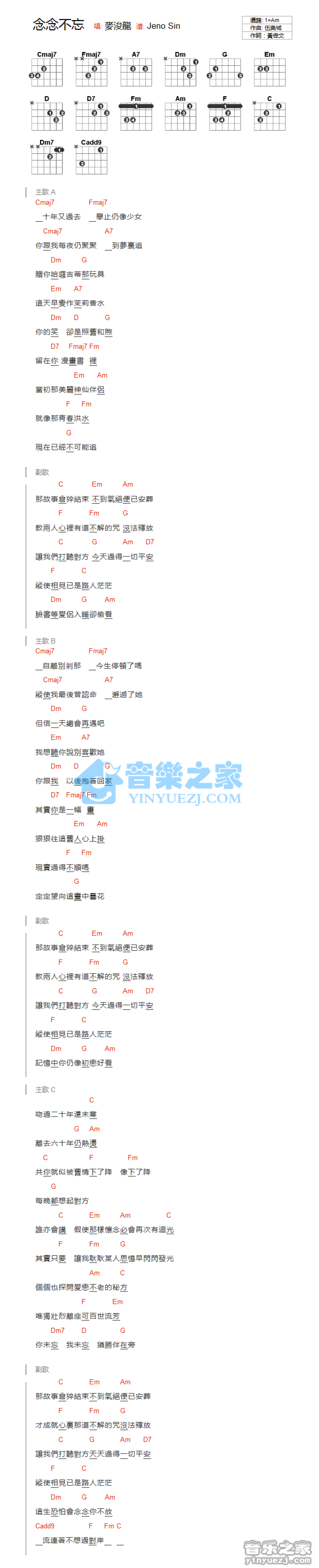 曲谱介绍: Am调版《念念不忘》吉他和弦弹唱谱