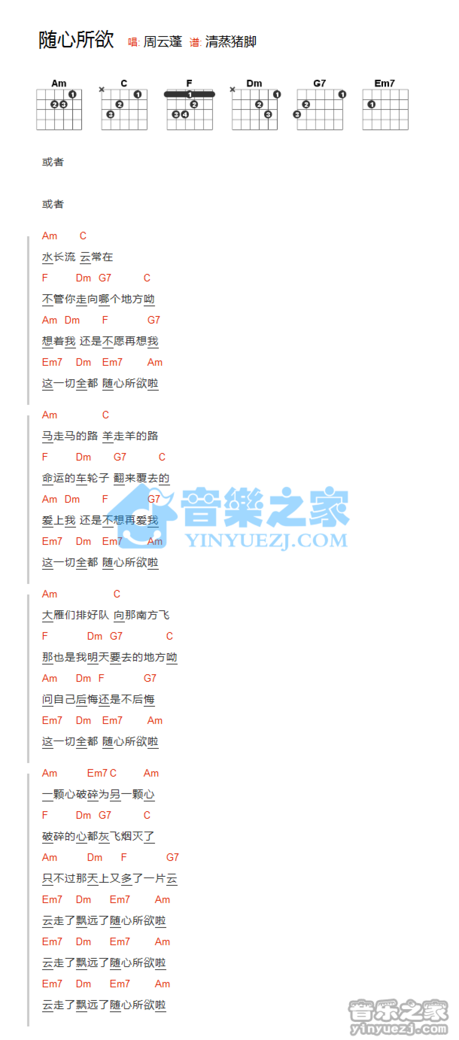 曲谱介绍: 《随心所欲》吉他和弦弹唱谱