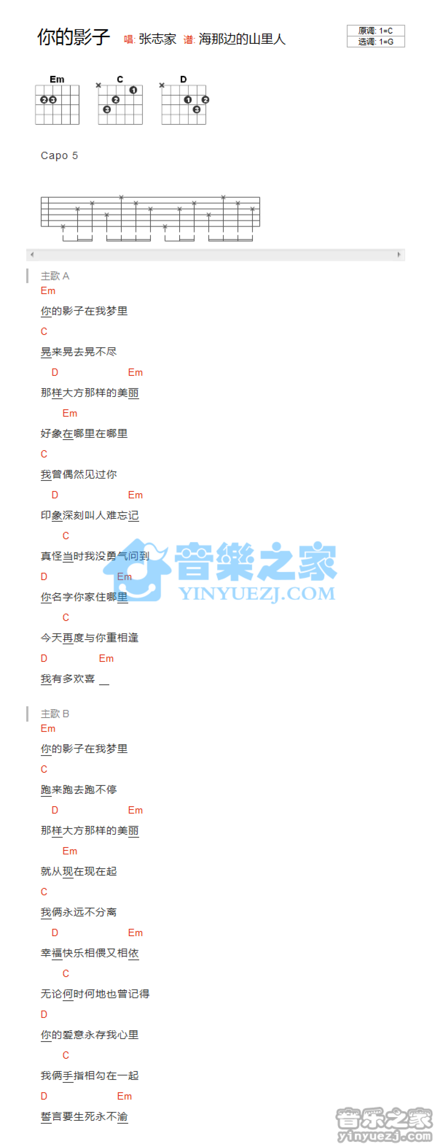 你的影子吉他谱 - 张志家 - G调吉他弹唱谱 - 和弦谱