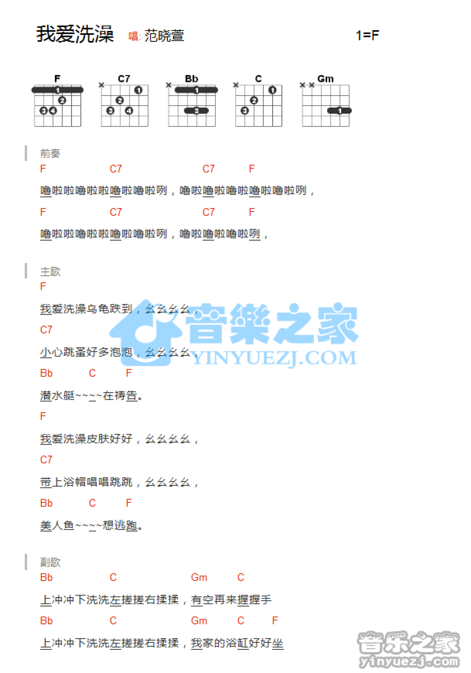 曲谱介绍: F调版《我爱洗澡》吉他和弦弹唱谱