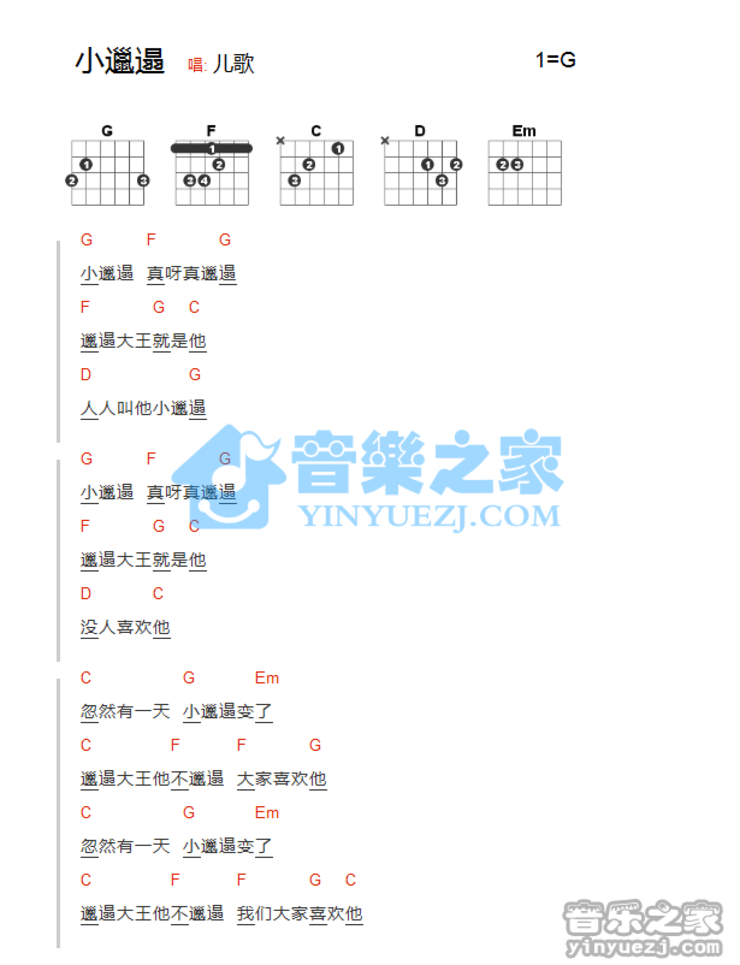 曲谱介绍: G调版《小邋遢》吉他和弦弹唱谱
