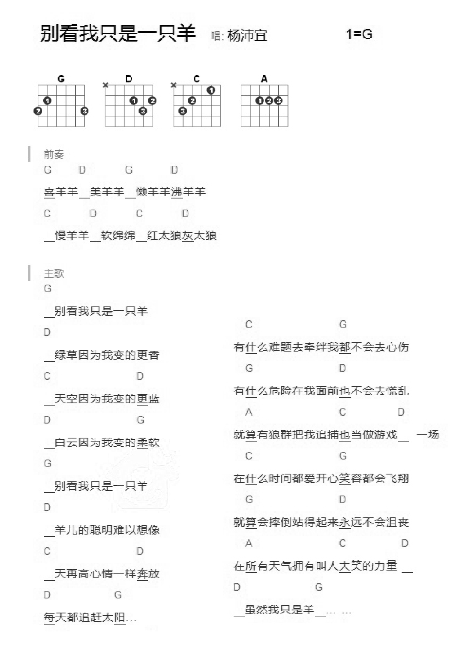 曲谱介绍: G调版《别看我只是一只羊》吉他和弦弹唱谱