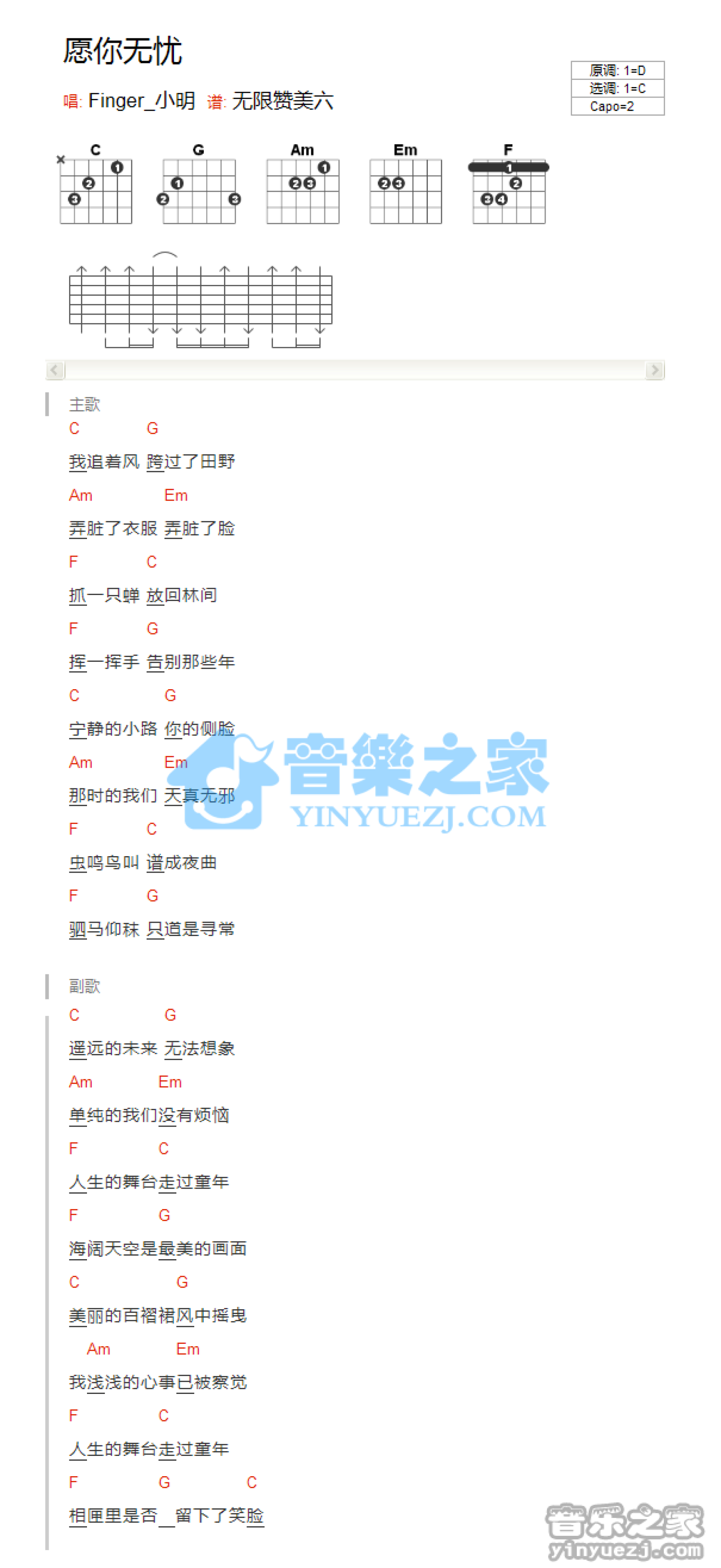 愿你无忧吉他谱 - Finger小明 - C调吉他弹唱谱 - 和弦谱