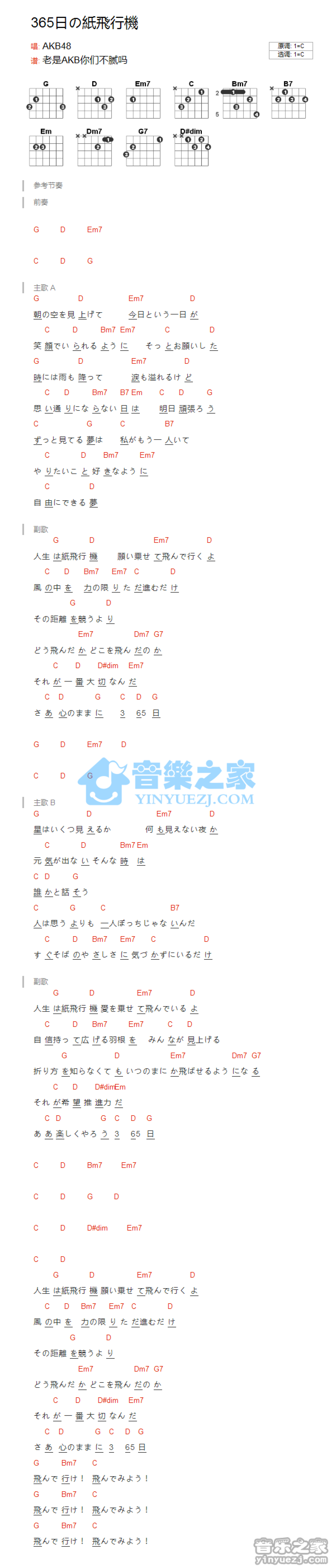 365日的纸飞行机吉他谱 - AKB48 - C调吉他弹唱谱 - 和弦谱