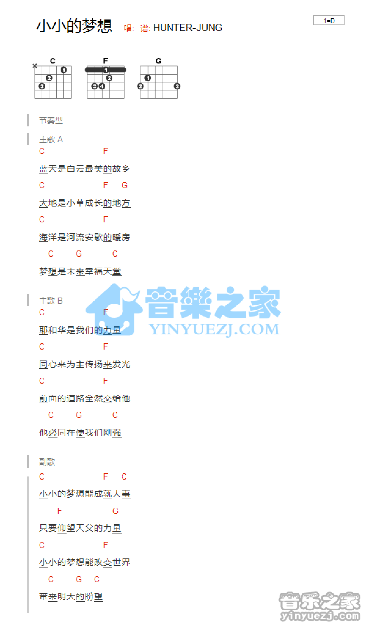 曲谱介绍: D调版《小小的梦想》吉他和弦弹唱谱