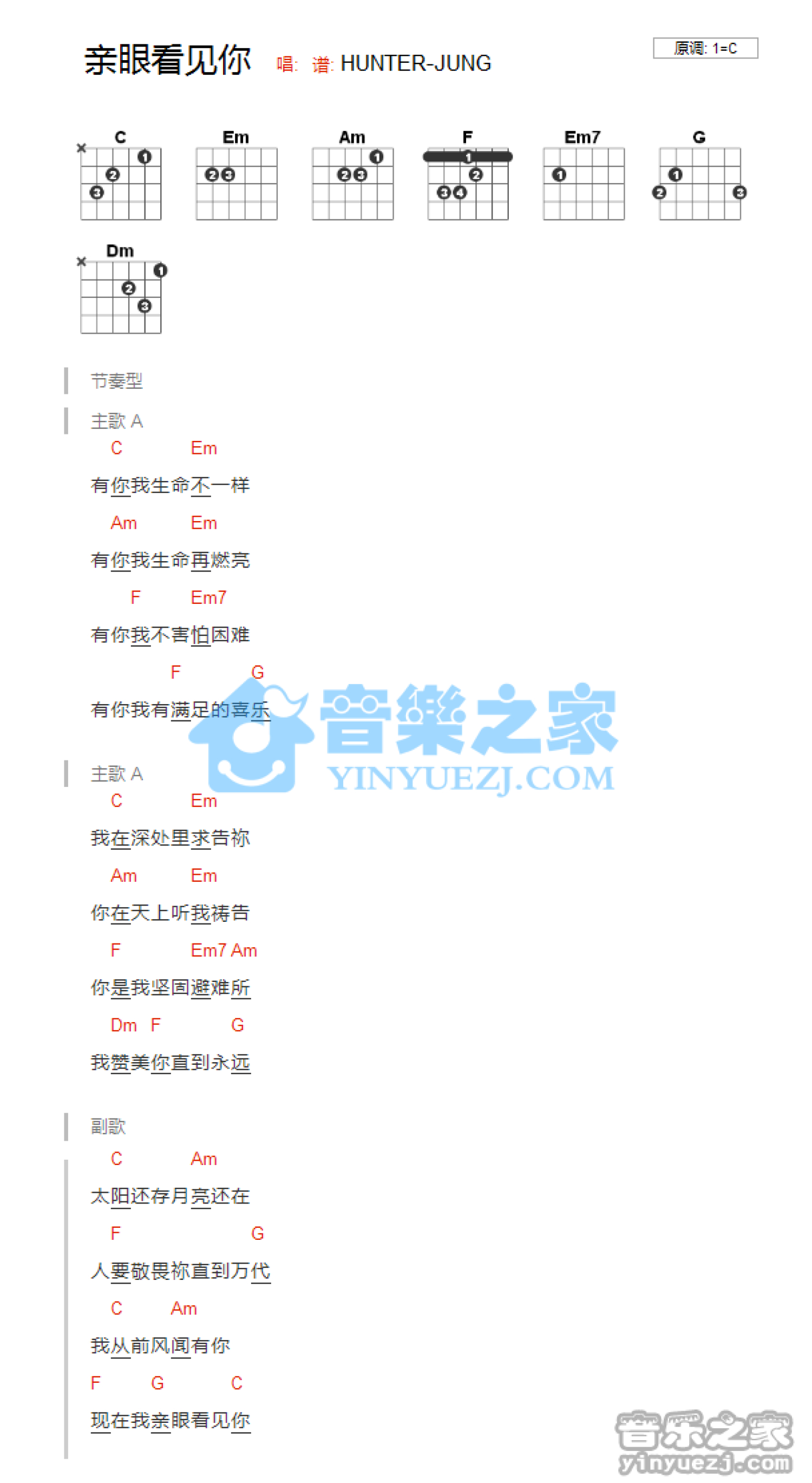 曲谱介绍: C调版《亲眼看见你》吉他和弦弹唱谱