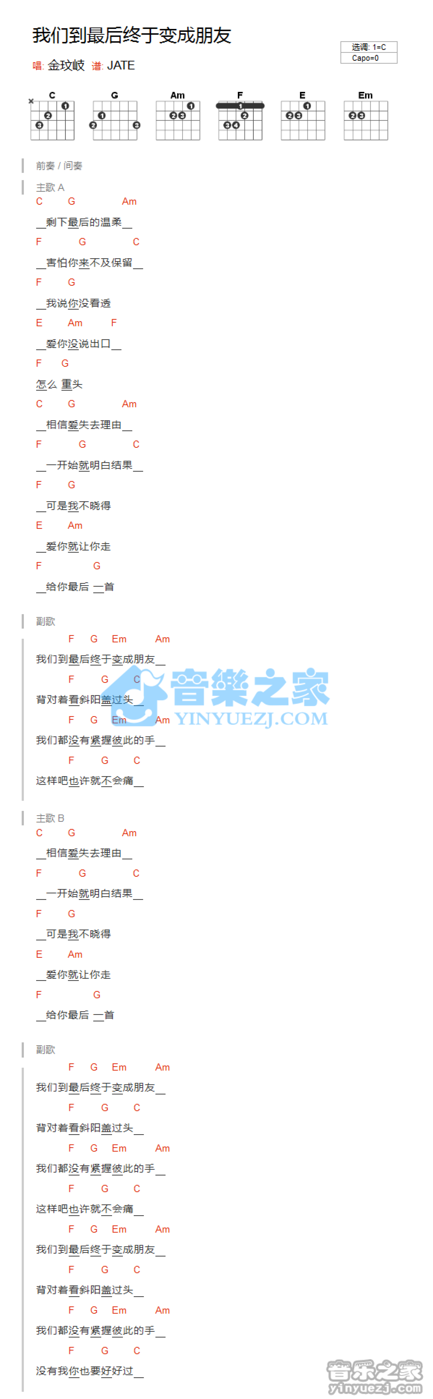 曲谱介绍: C调版《我们到最后终于变成朋友》吉他和弦弹唱谱
