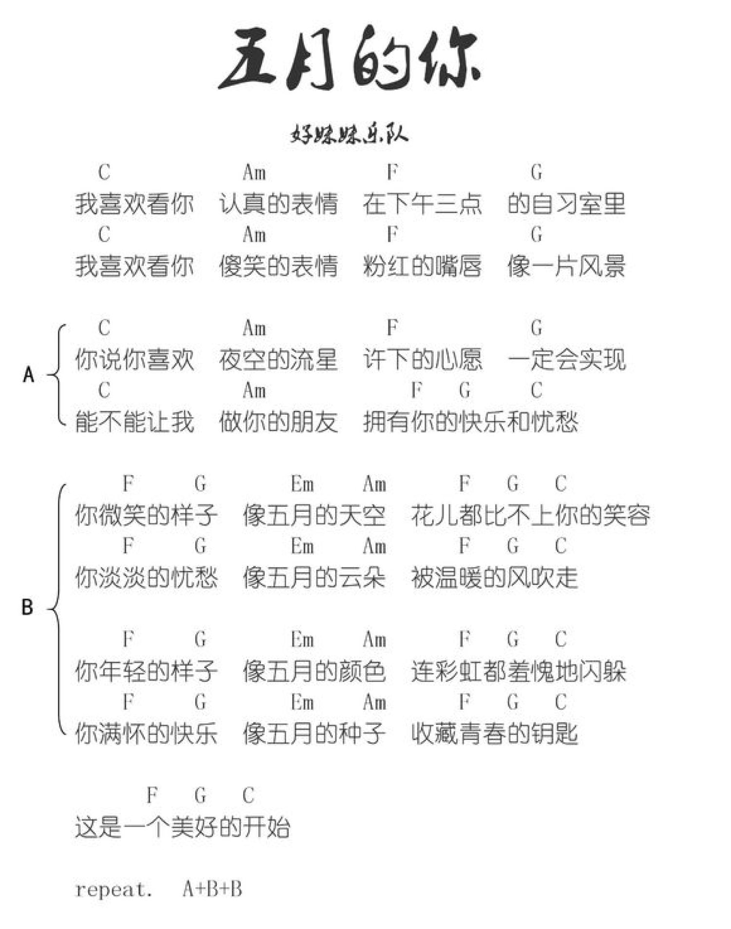 曲谱介绍: 《五月的你》吉他和弦弹唱谱