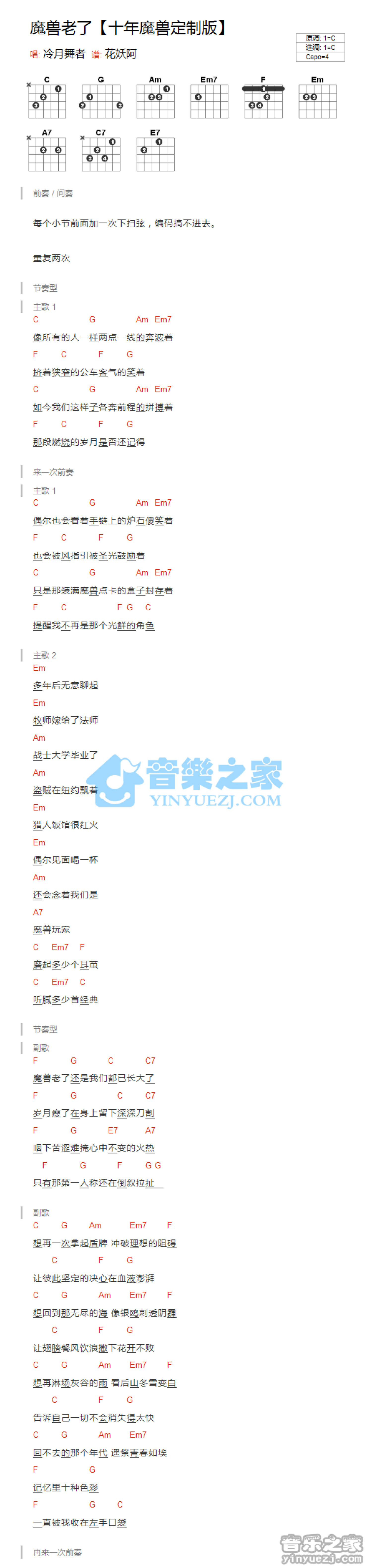 曲谱介绍: C调版《魔兽老了》吉他和弦弹唱谱
