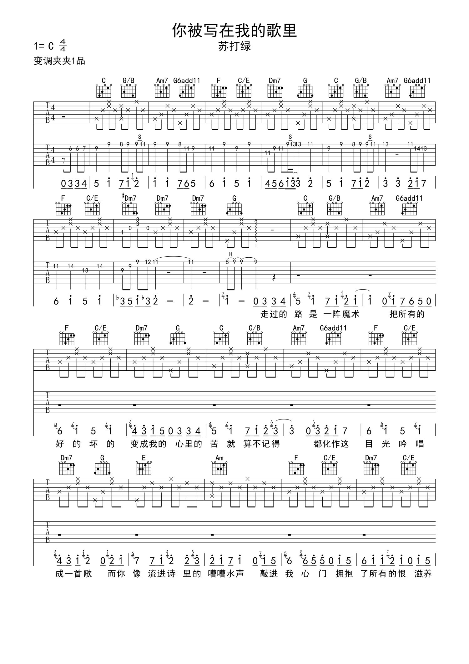曲谱介绍: 你被写在我的歌里吉他谱,苏打绿Ella的一首小甜歌,C调指法弹唱谱,变调夹夹一品。吴青峰的温柔声线,让人合着旋律轻轻摇摆,第一次听到这首歌就觉得被甜到了,满满的幸福感,小清新的曲调真的甜腻腻。