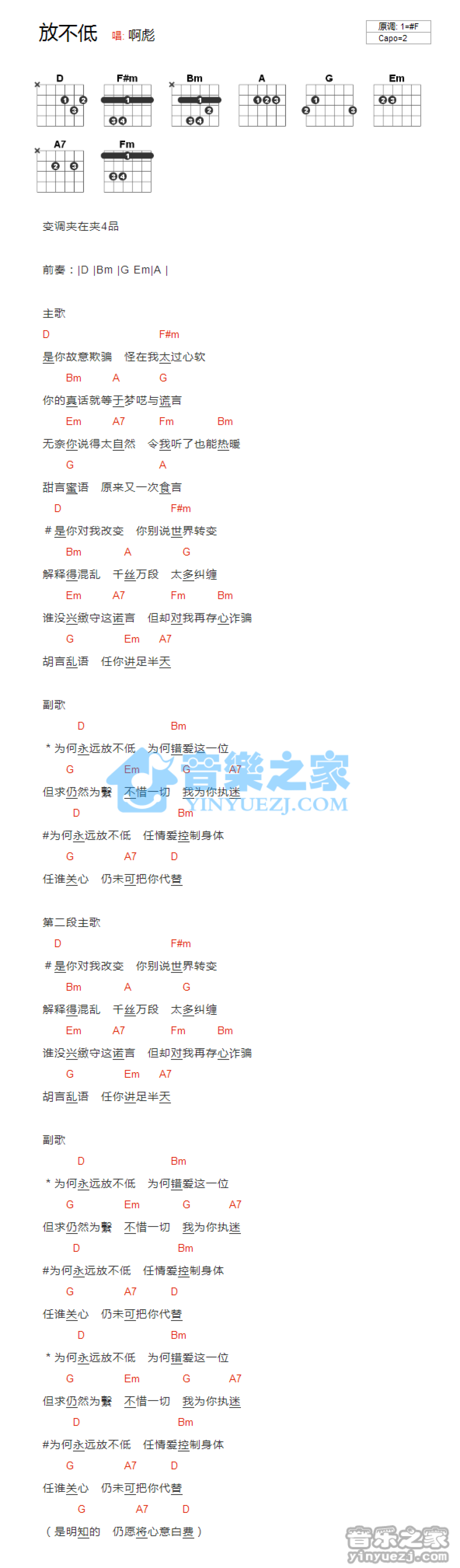 曲谱介绍: #F调版《放不低》吉他和弦弹唱谱