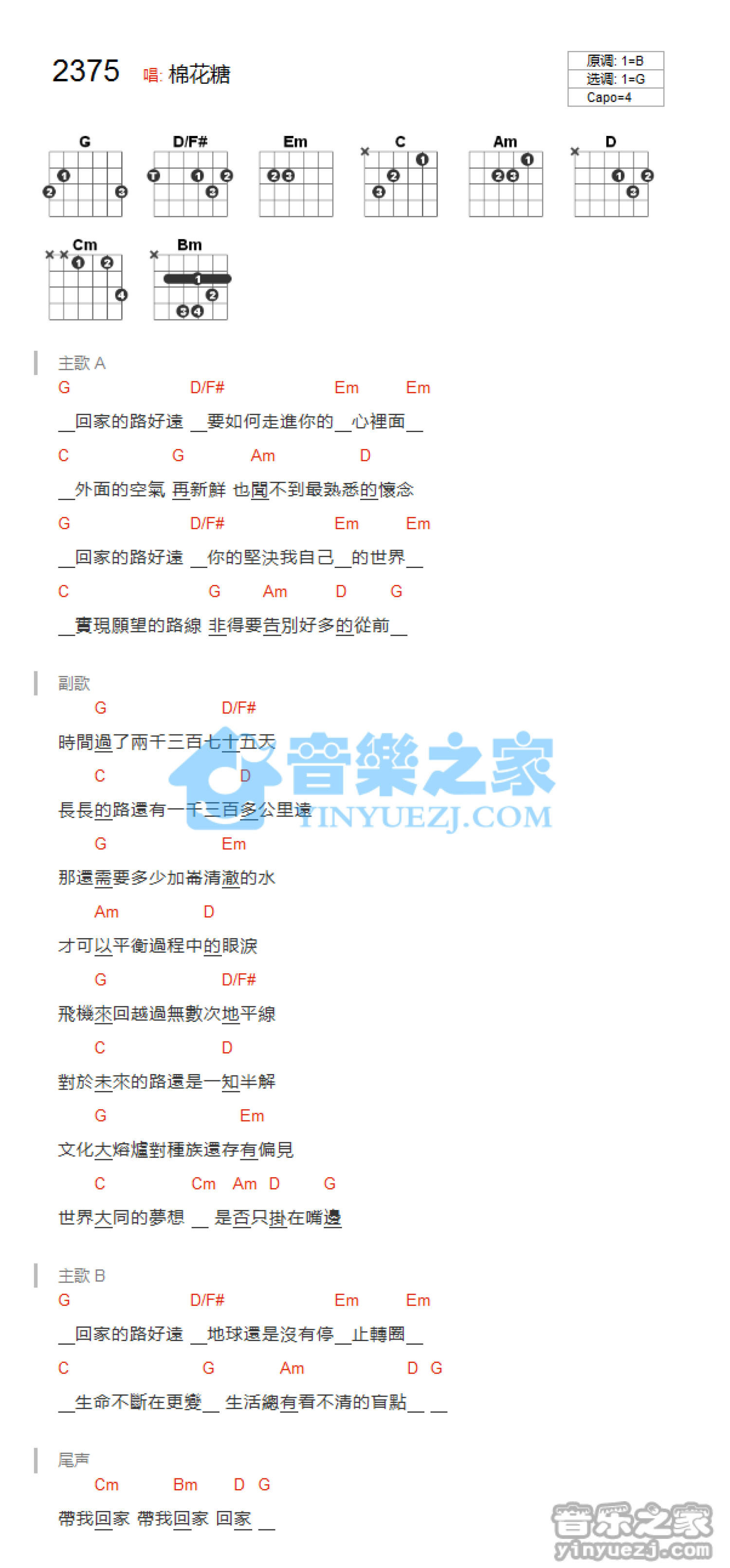 曲谱介绍: G调版《2375》吉他和弦弹唱谱