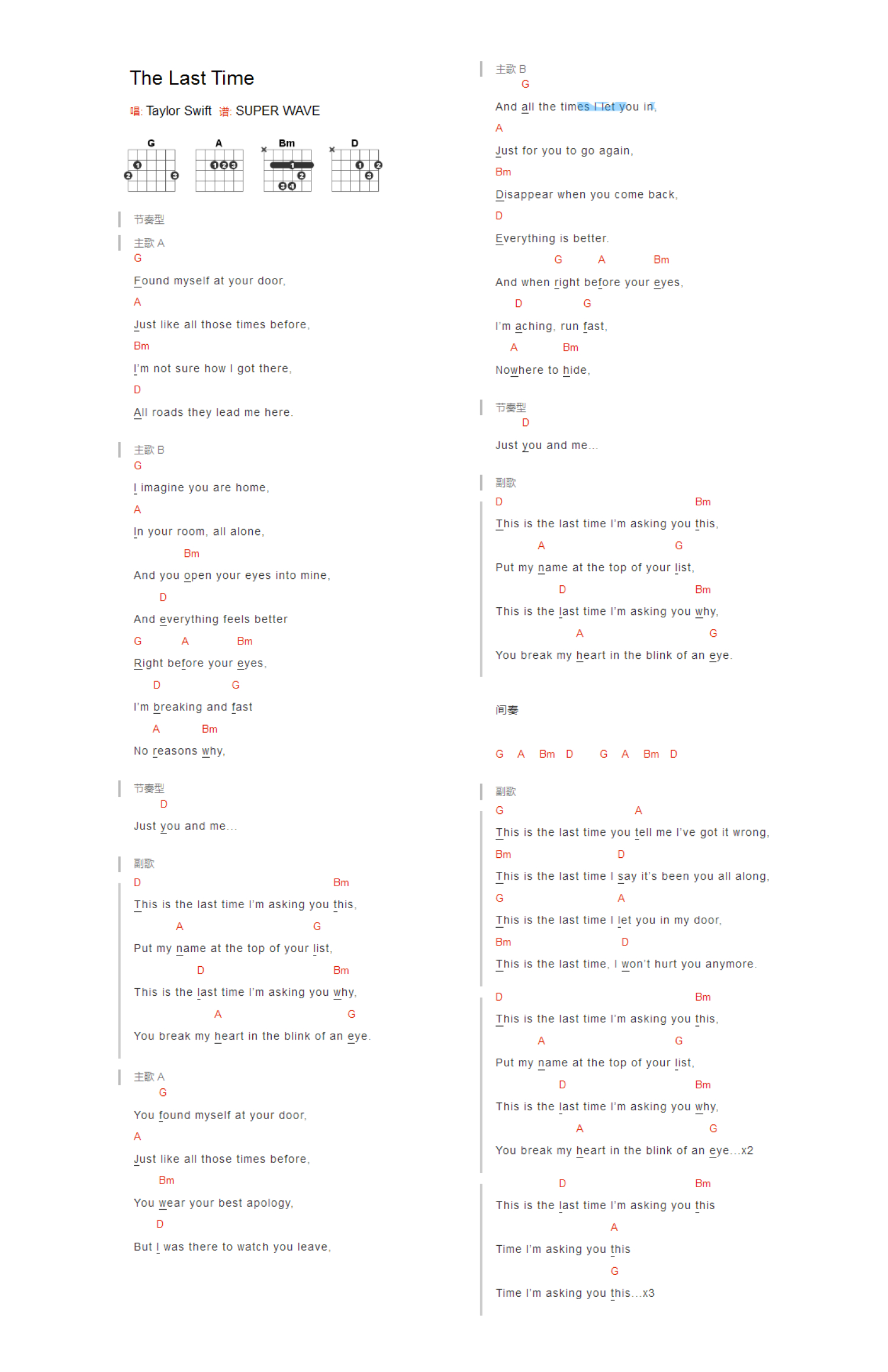 The Last Time吉他谱 - TaylorSwift - C调吉他弹唱谱 - 和弦谱
