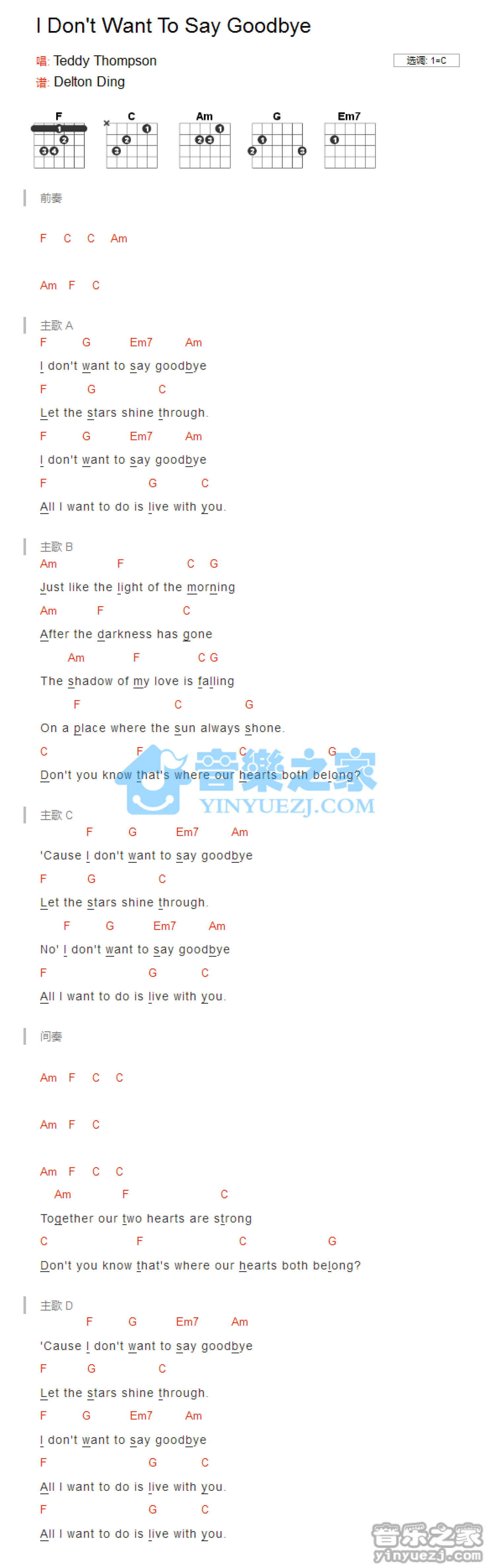 曲谱介绍: C调版《IDon'tWantToSayGoodbye》吉他和弦弹唱谱