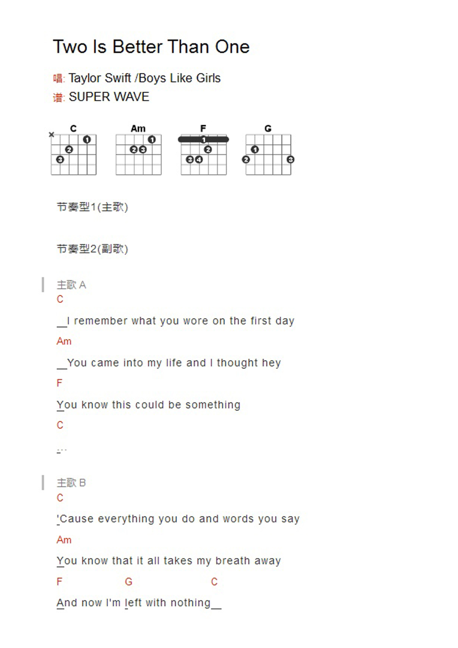 Two Is Beter Than One吉他谱 - TaylorSwift - C调吉他弹唱谱 - 和弦谱