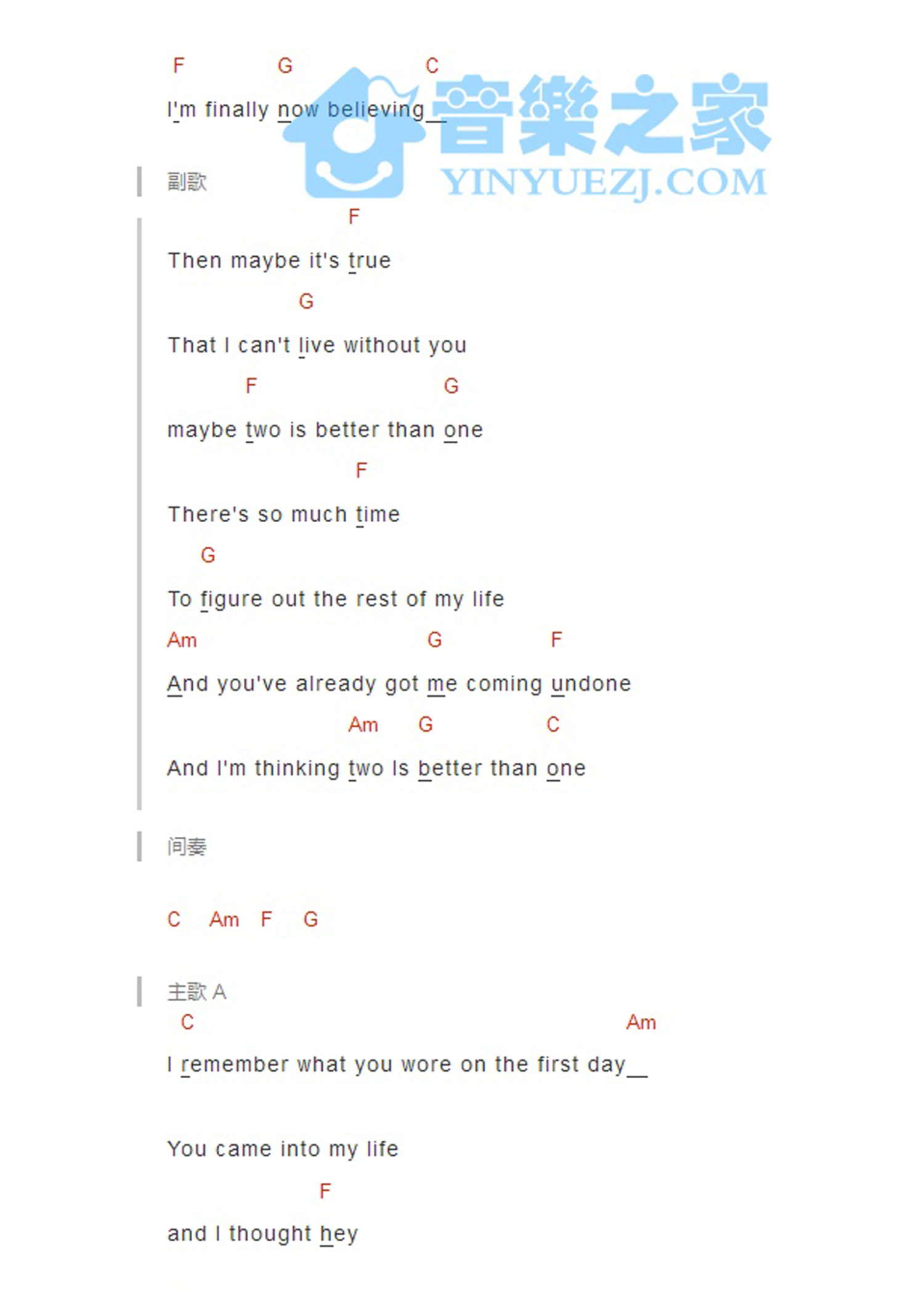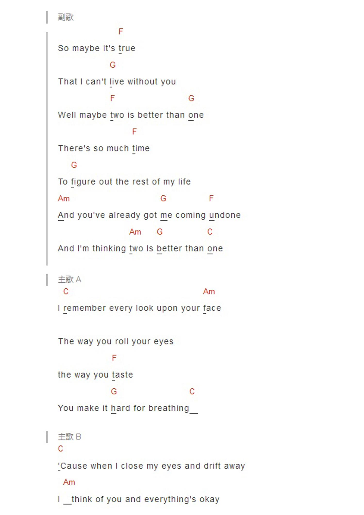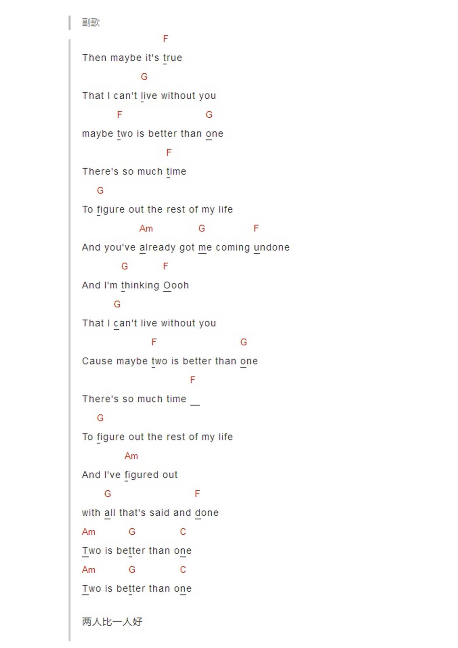 曲谱介绍: 《TwoIsBeterThanOne》吉他和弦弹唱谱