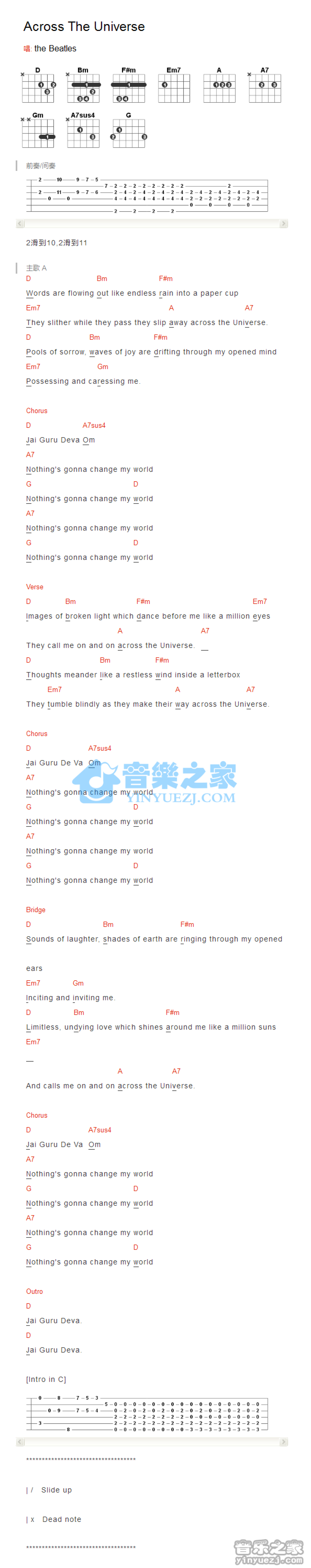 曲谱介绍: 《AcrossTheUniverse》吉他和弦弹唱谱