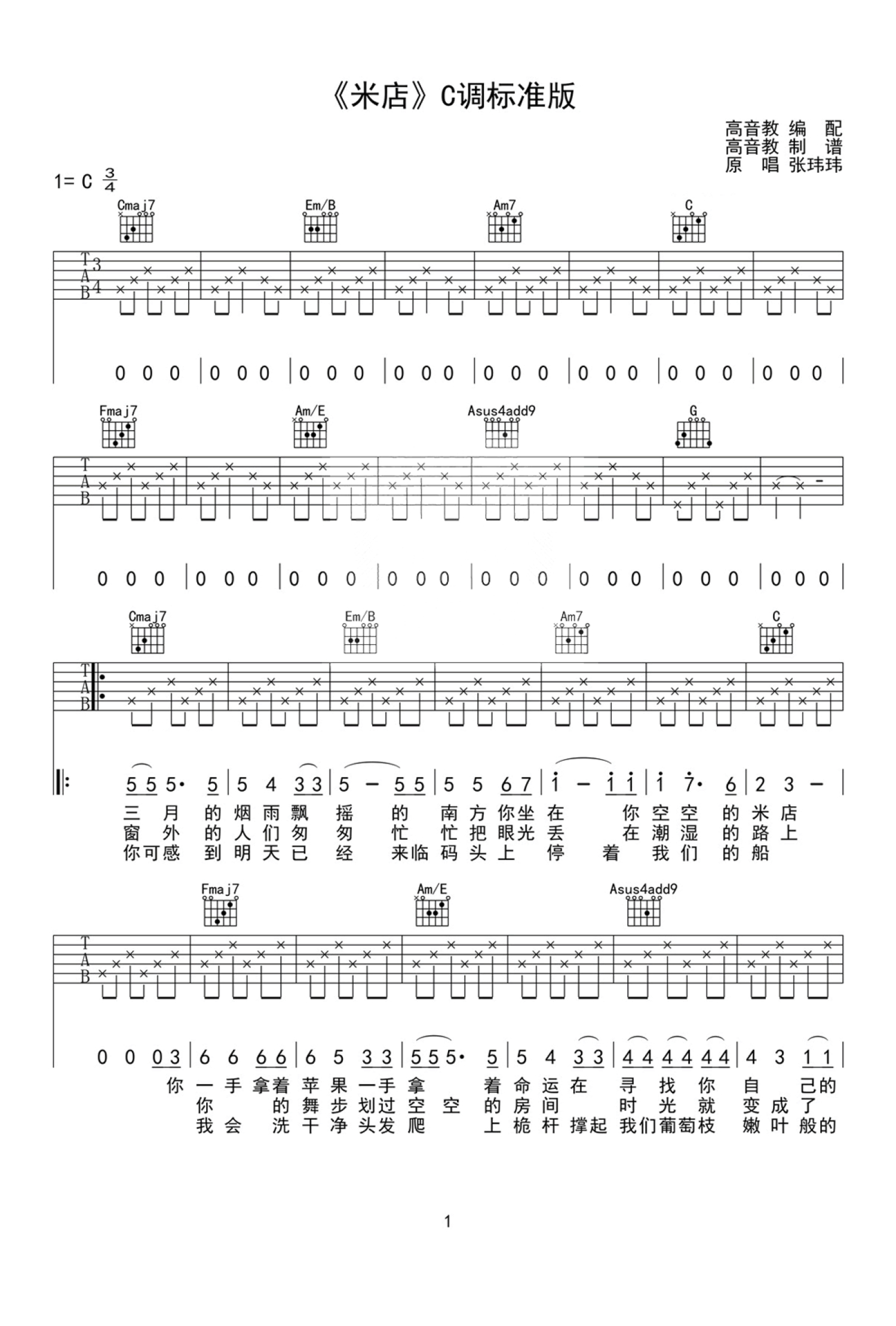 米店吉他谱 - 张玮玮/李志 - C调吉他弹唱谱 - 标准版