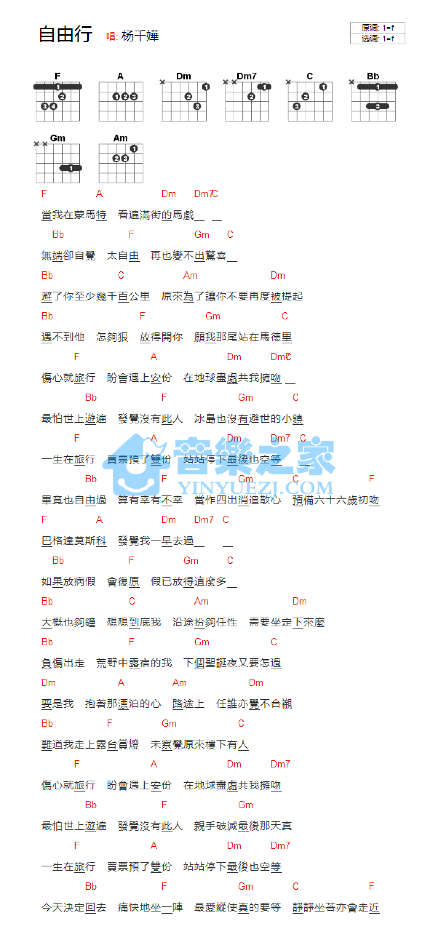 曲谱介绍: 杨千嬅《自由行》吉他谱_F调吉他弹唱谱