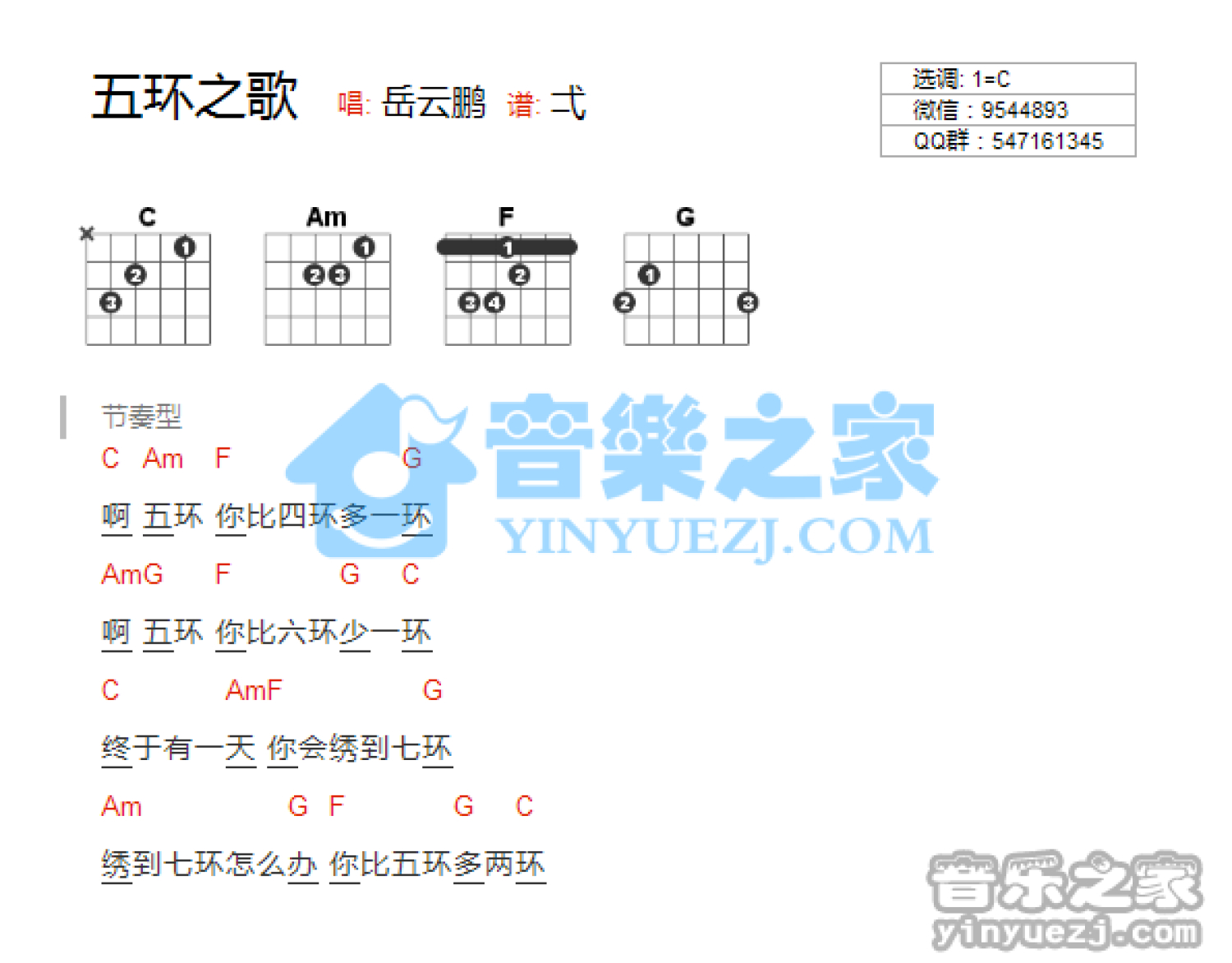 五环之歌吉他谱 - 岳云鹏 - C调吉他弹唱谱 - 和弦谱