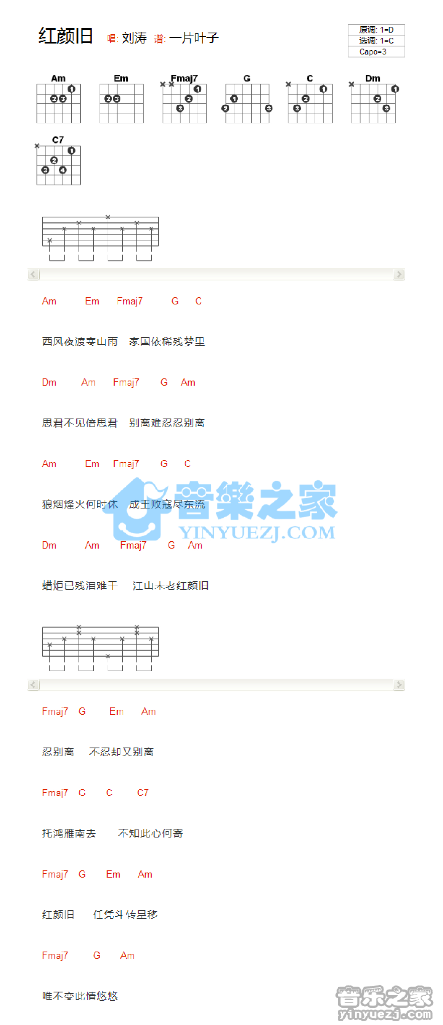 曲谱介绍: C调版《红颜旧》吉他和弦弹唱谱