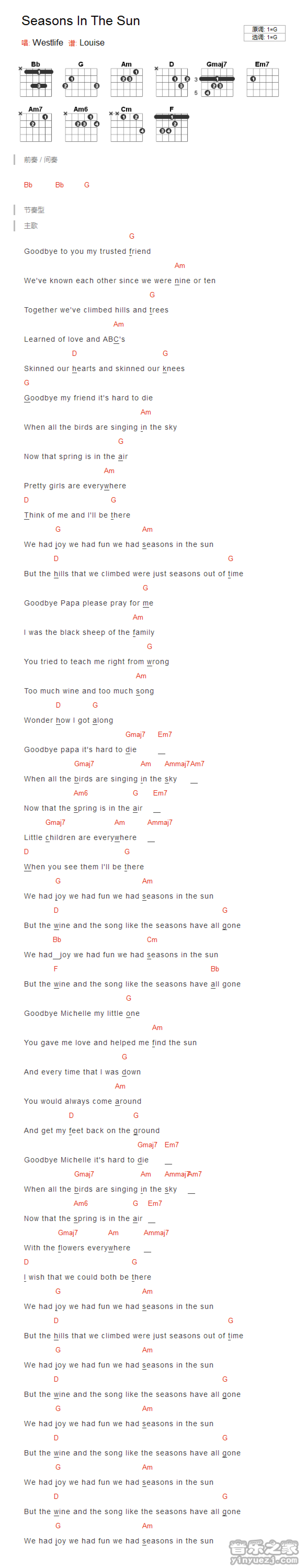 曲谱介绍: G调版《SeasonsInTheSon》吉他和弦弹唱谱