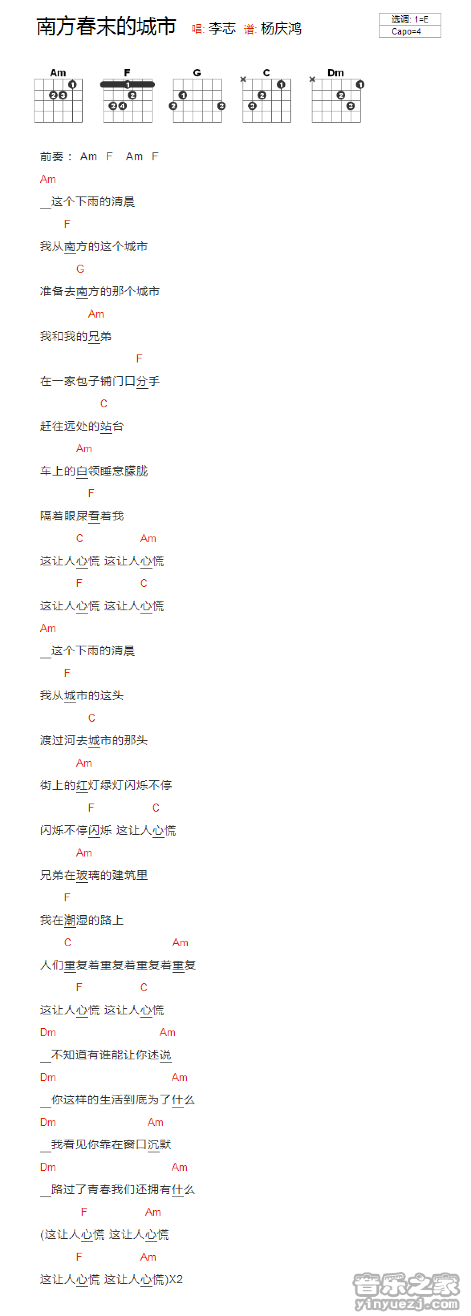 曲谱介绍: E调版《南方春末的城市》吉他和弦弹唱谱