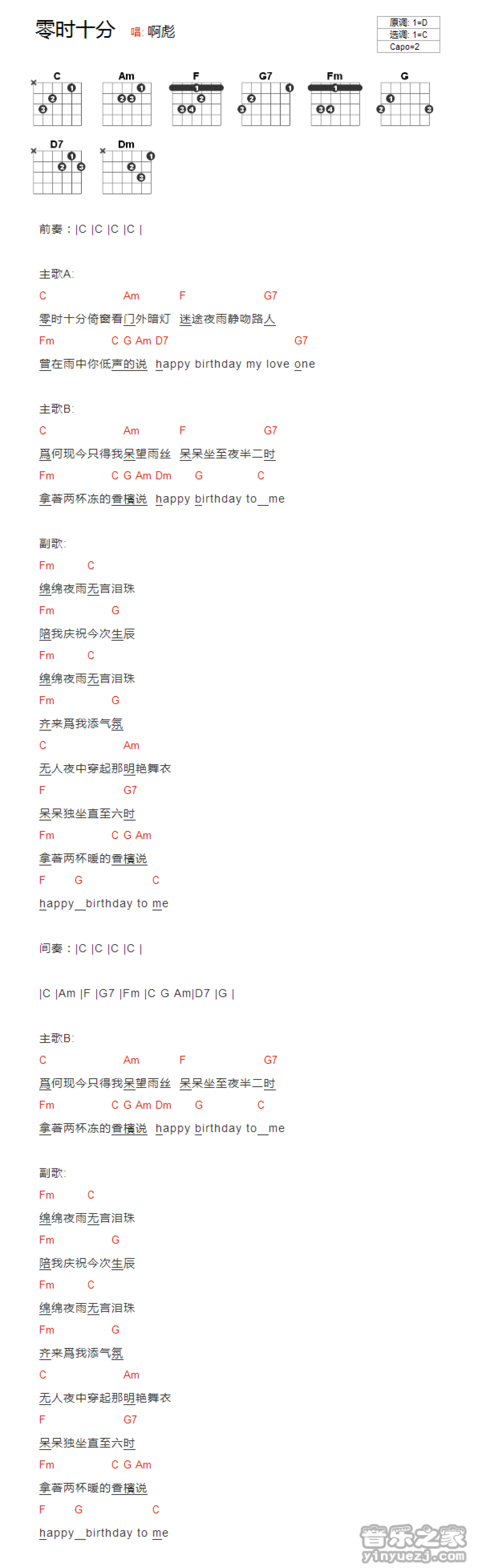 曲谱介绍: C调版《零时十分》吉他和弦弹唱谱