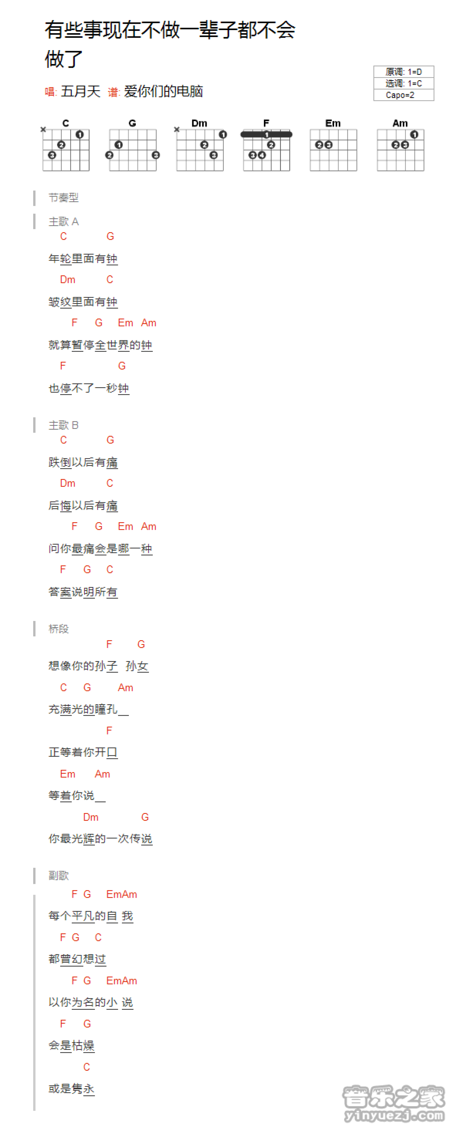 曲谱介绍: C调版《有些事情现在不做一辈子都不会做了》吉他和弦弹唱谱