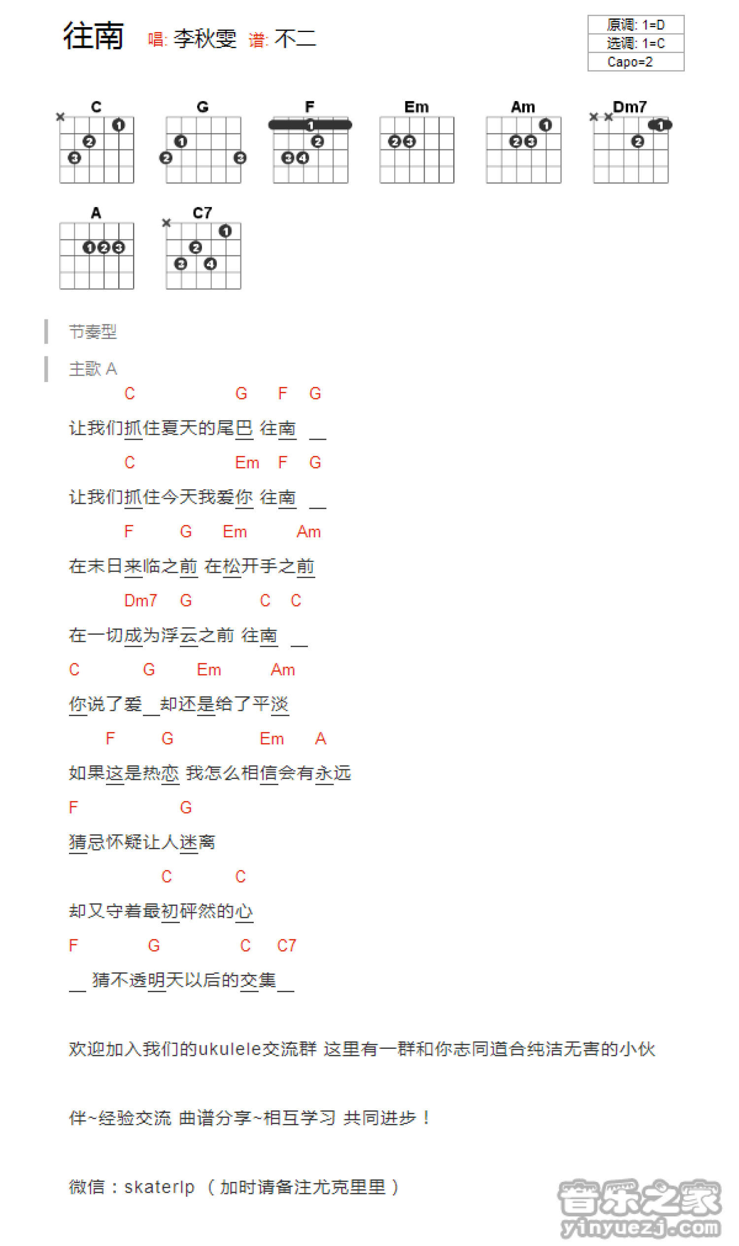 曲谱介绍: C调版《往南》吉他和弦弹唱谱