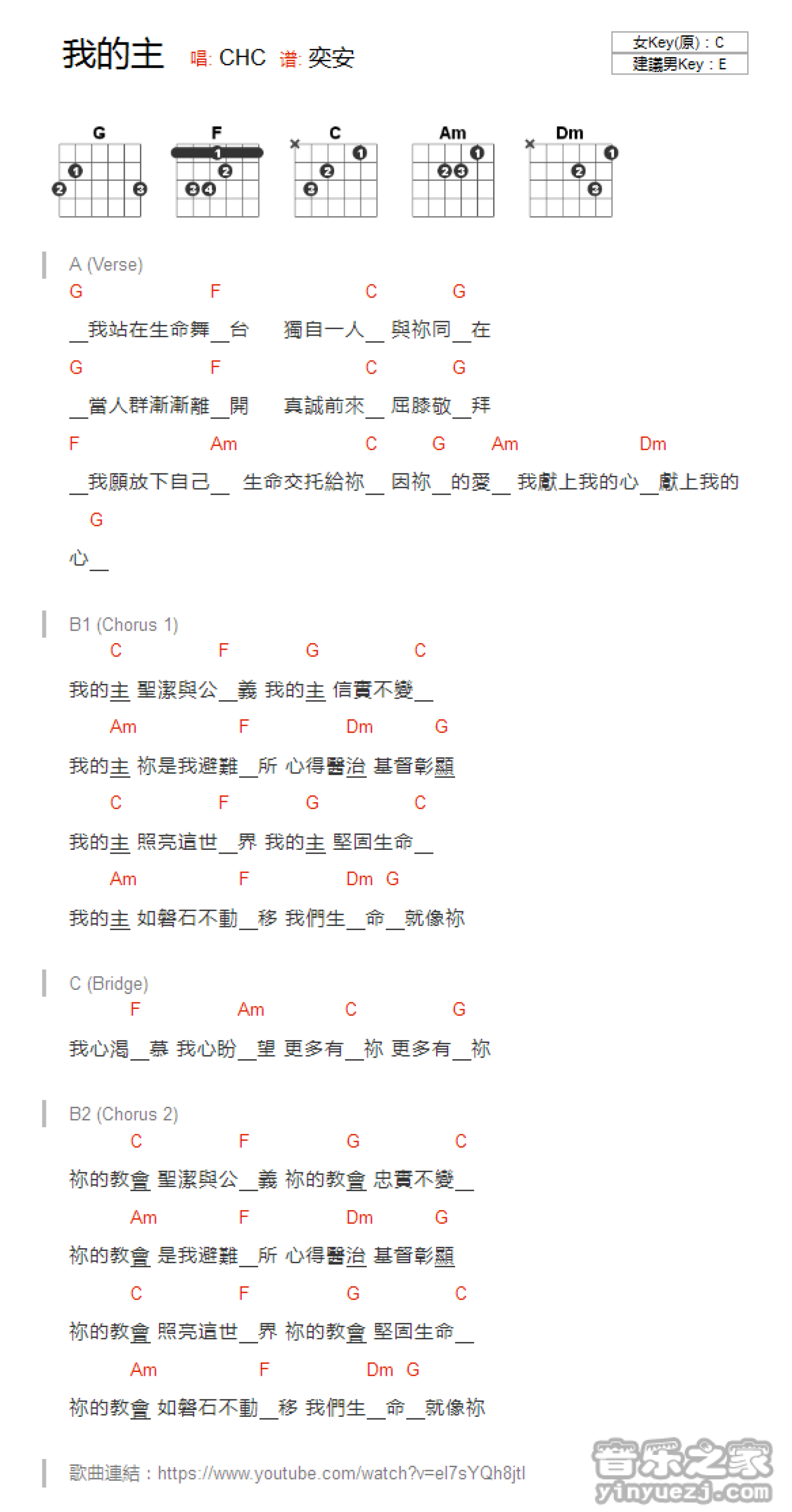 曲谱介绍: C调版《我的主》吉他和弦弹唱谱