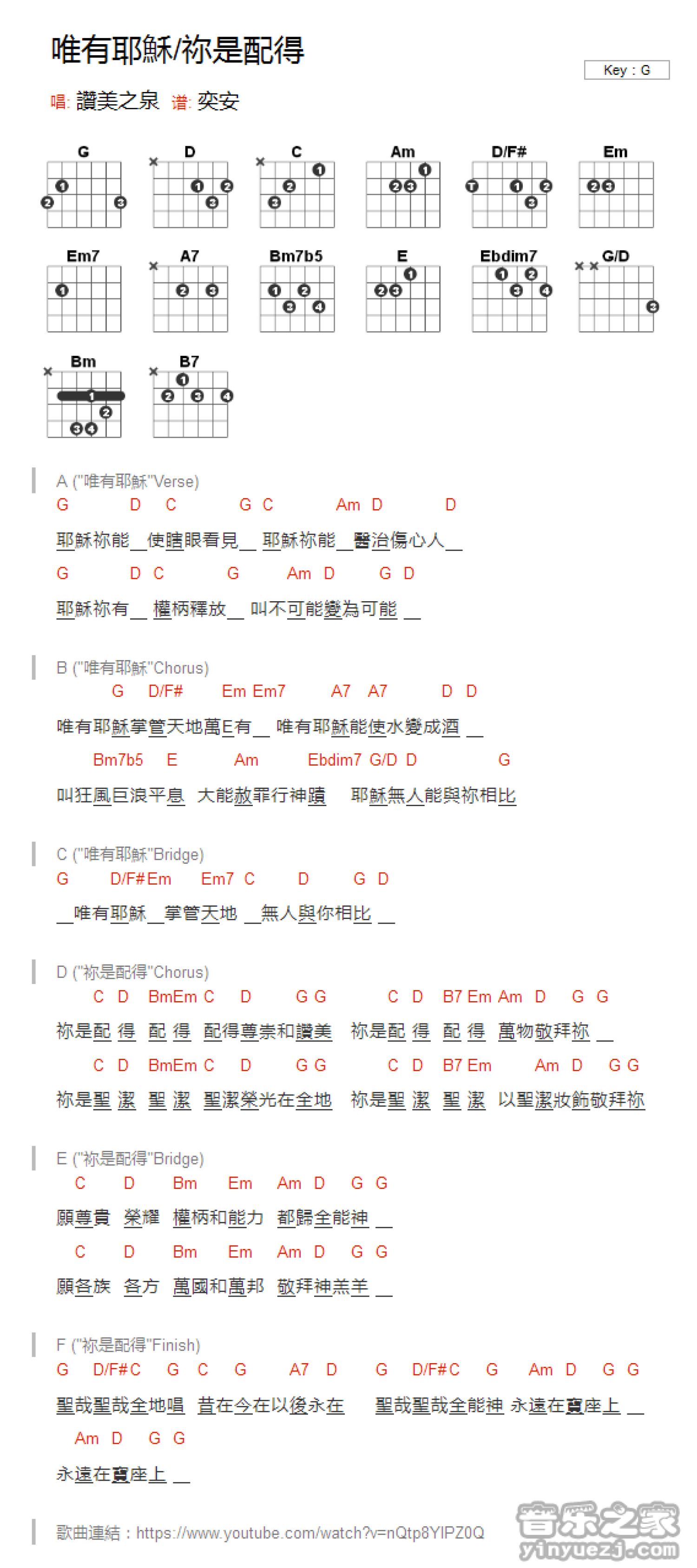 曲谱介绍: G调版《唯有耶稣/你是配得》吉他和弦弹唱谱