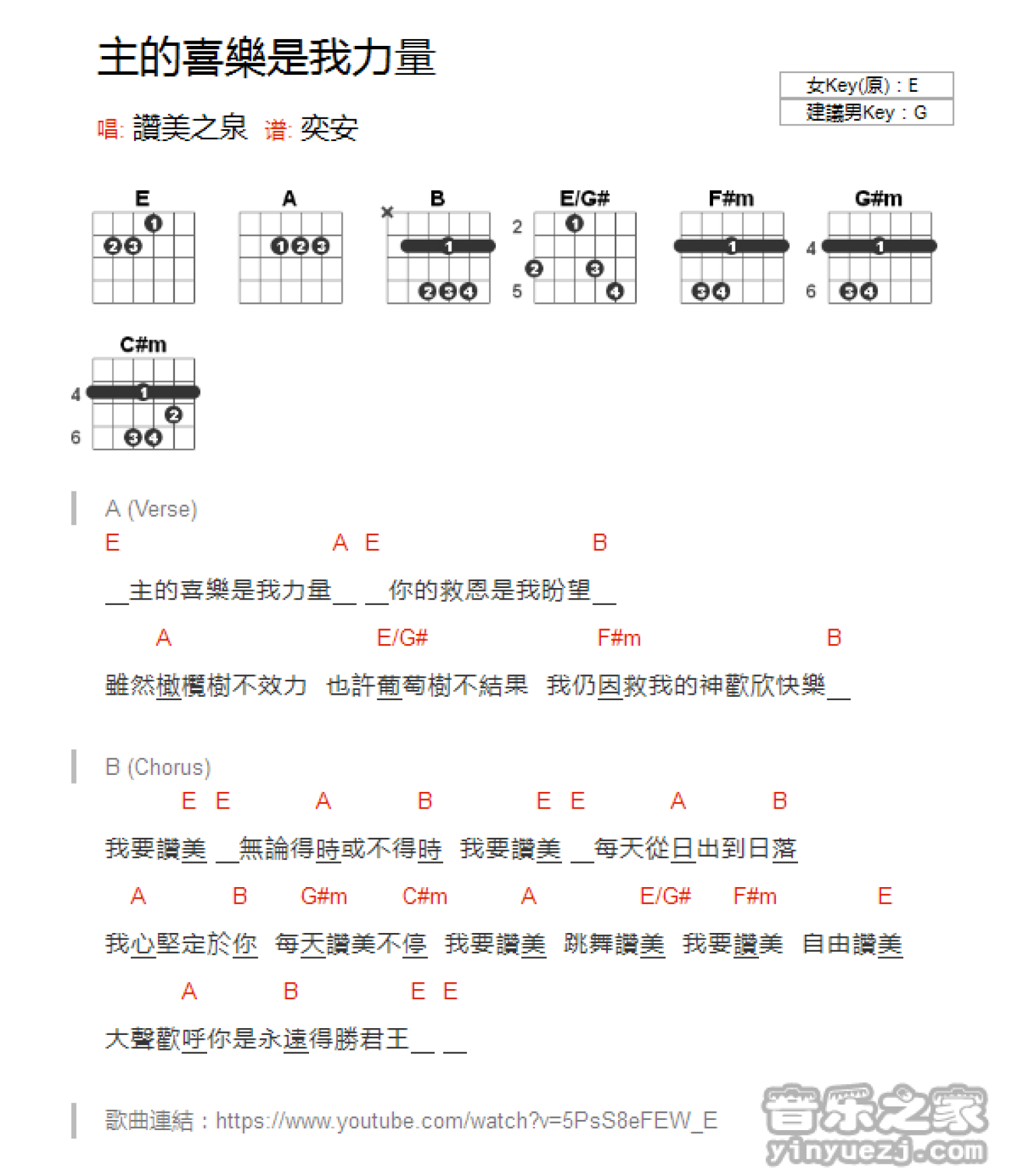 主的喜乐是我力量吉他谱 - 赞美之泉 - E调吉他弹唱谱 - 和弦谱
