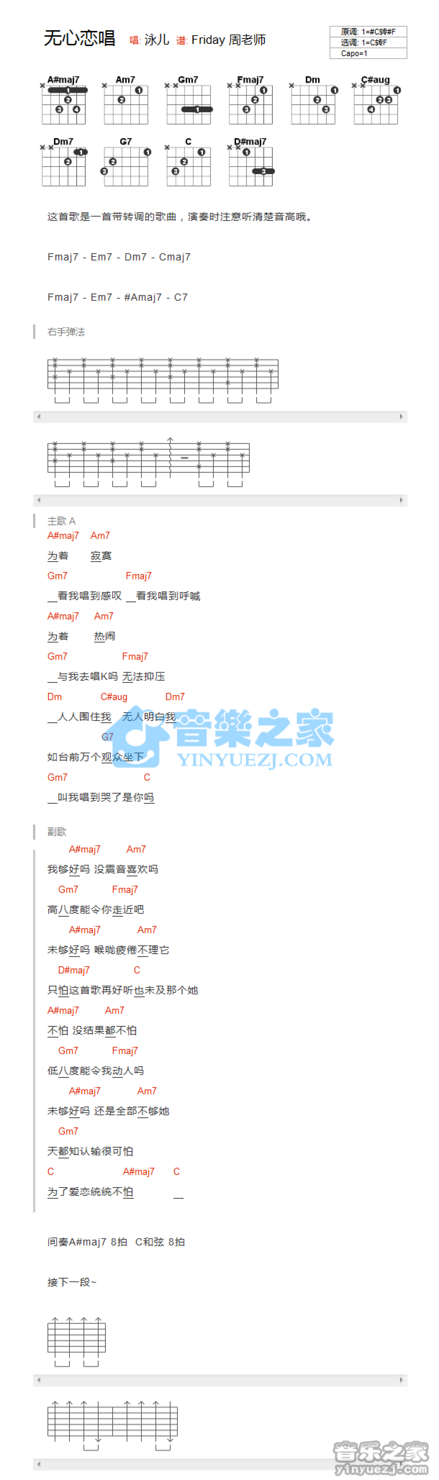 曲谱介绍: C转F调版《无心恋唱》吉他和弦弹唱谱