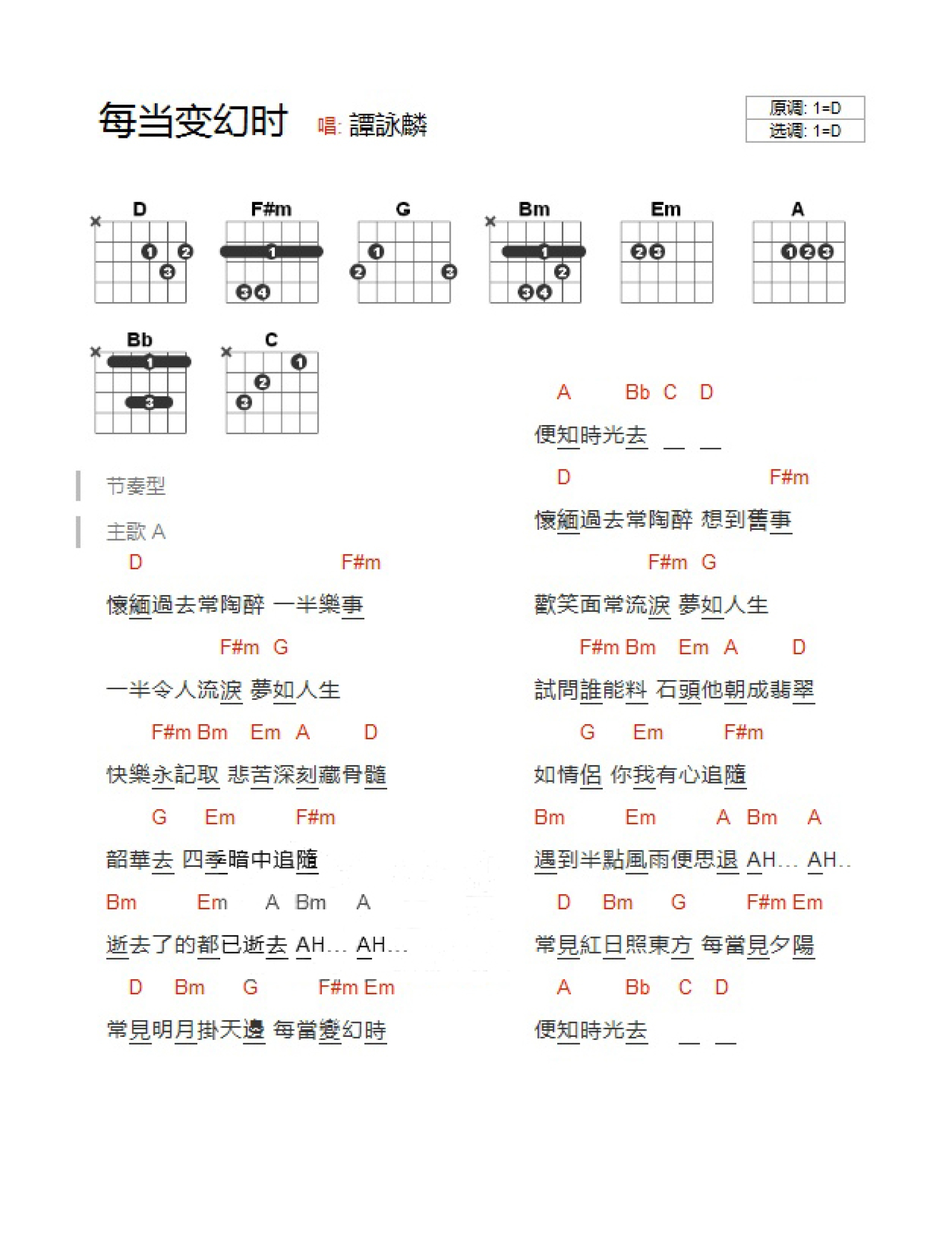 曲谱介绍: D调版《每当变幻时》吉他和弦弹唱谱