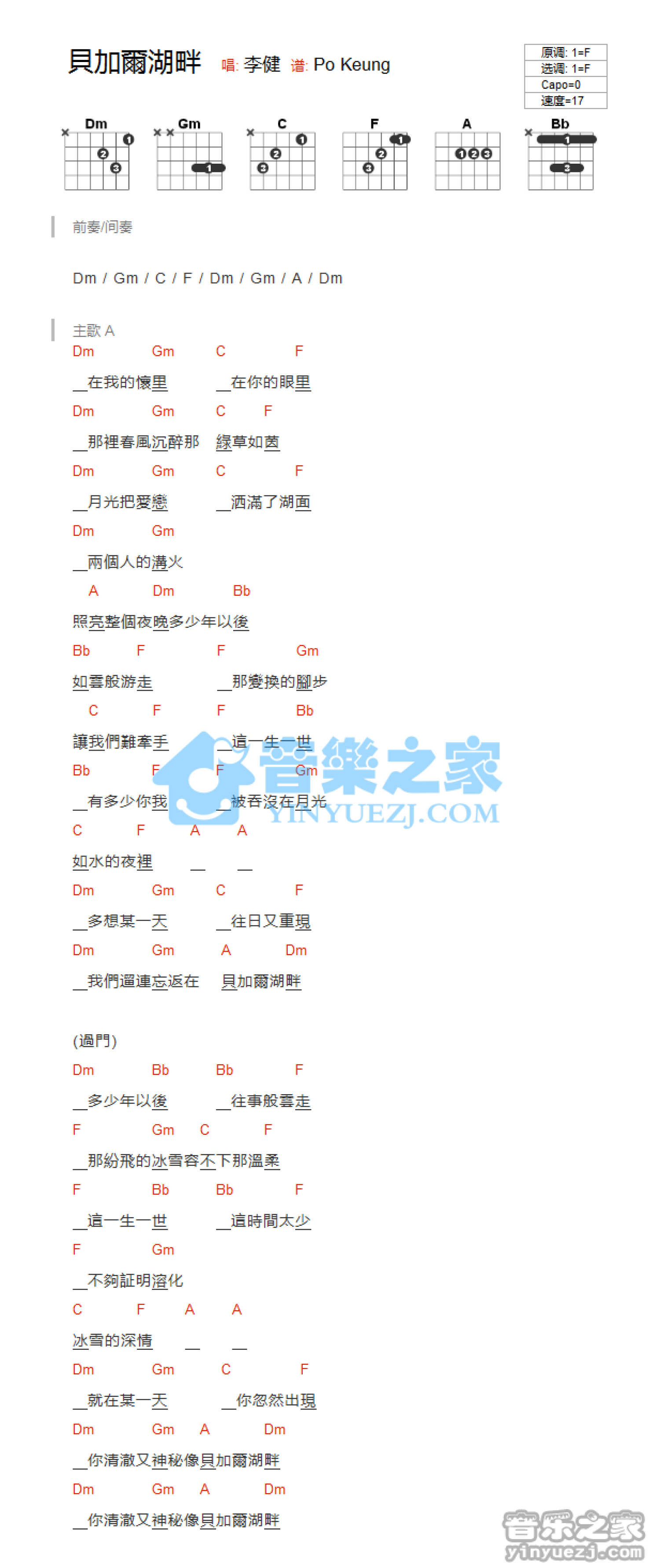 曲谱介绍: F调版《贝尔加湖畔》吉他和弦弹唱谱