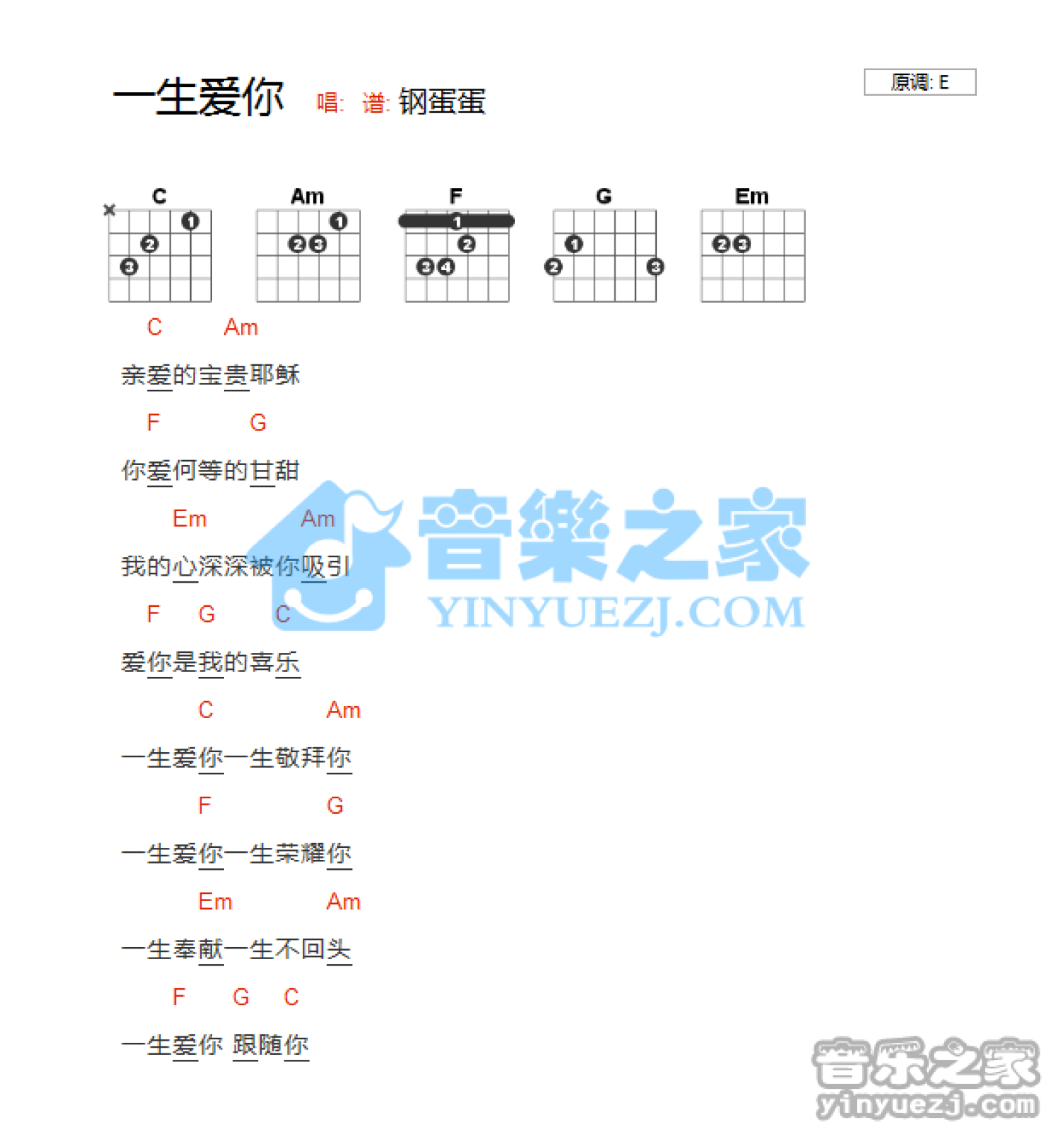 曲谱介绍: E调版 《一生爱你》吉他和弦弹唱谱